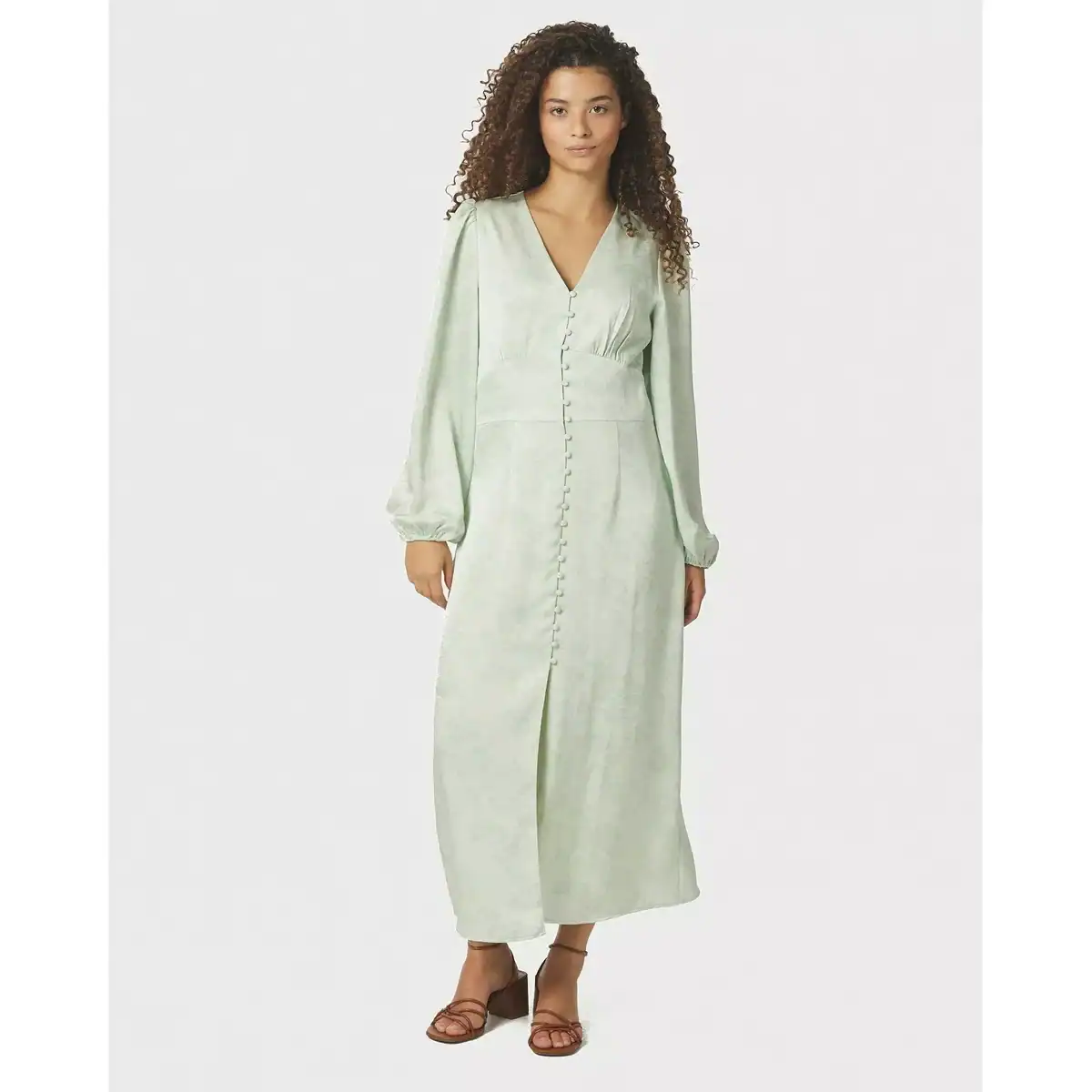 Ljusgrön klänning i en fin polyesterkvalitet. Klänningen har v-ringning, långa lösa ärmar och knappar längs framsidan.