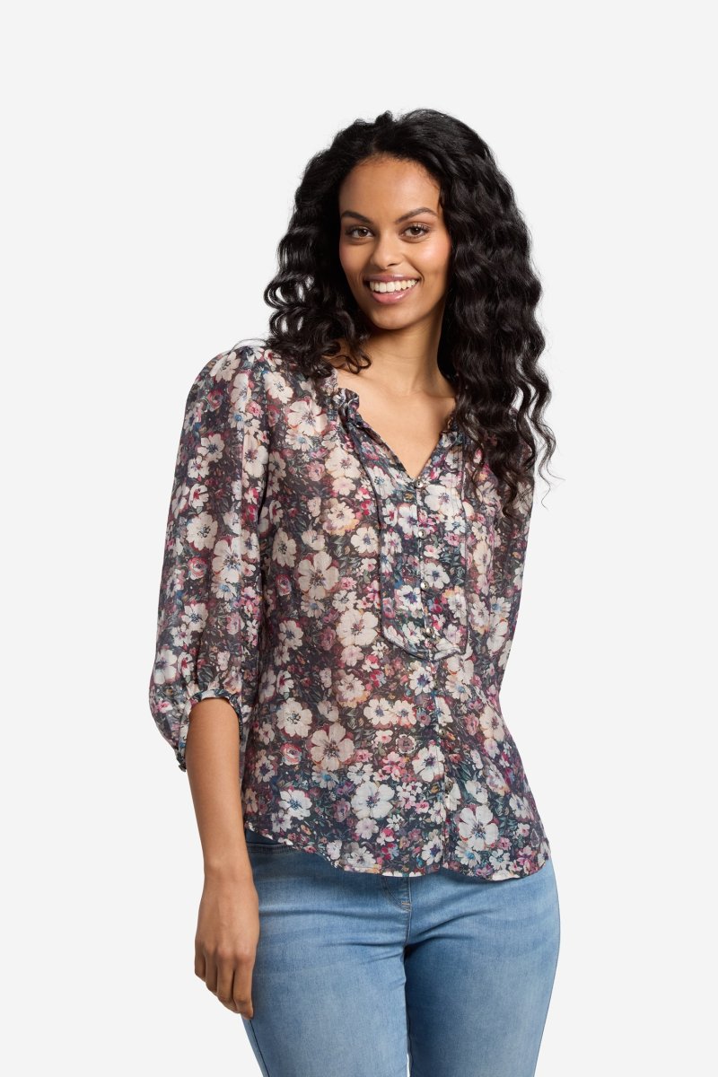 Slät blus med mjuk känsla och blommigt print. Rund halsringning med en kort volang runt om samt V-sprund i mitten. Frackok framtill med overlockade kanter, och knäppning i mitten med diskreta metallknappar i matchande färg. 3/4-lång ballongärm med ett återhållande band, samt knapp nertill. Den totala längden i storlek S är 63 cm från den högsta punkten under kragen.