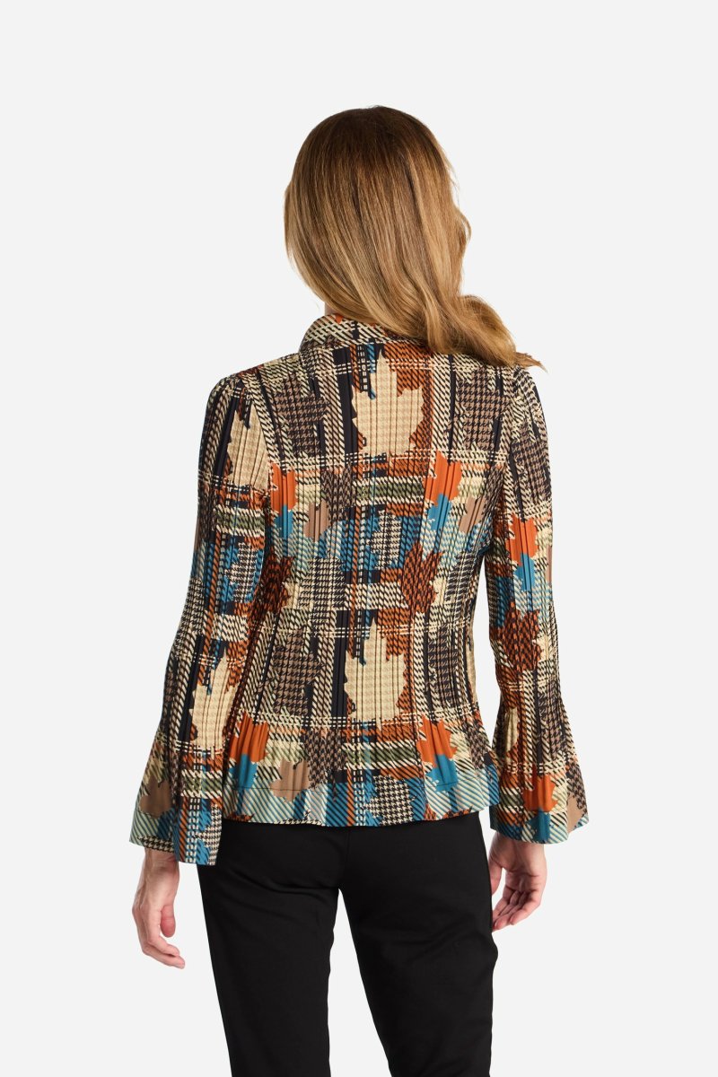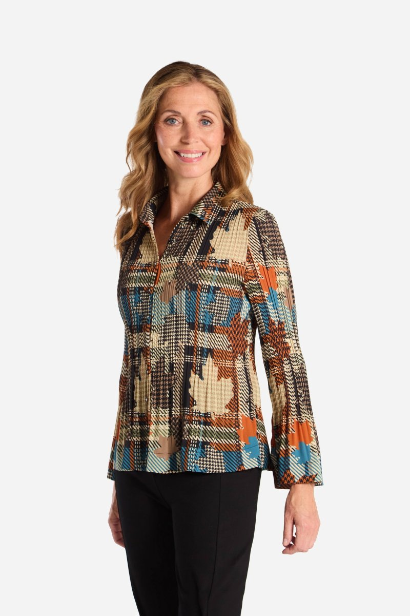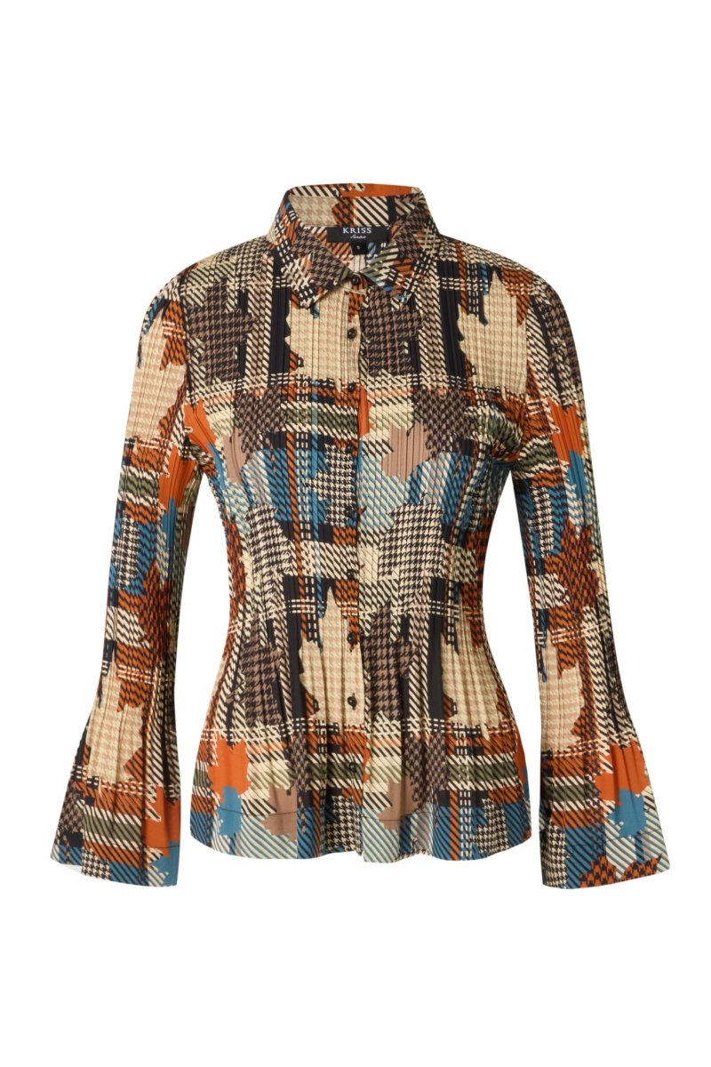 Plisserad blus med höstligt print och skjortkrage. Skön och silkig crepe kvalitet.