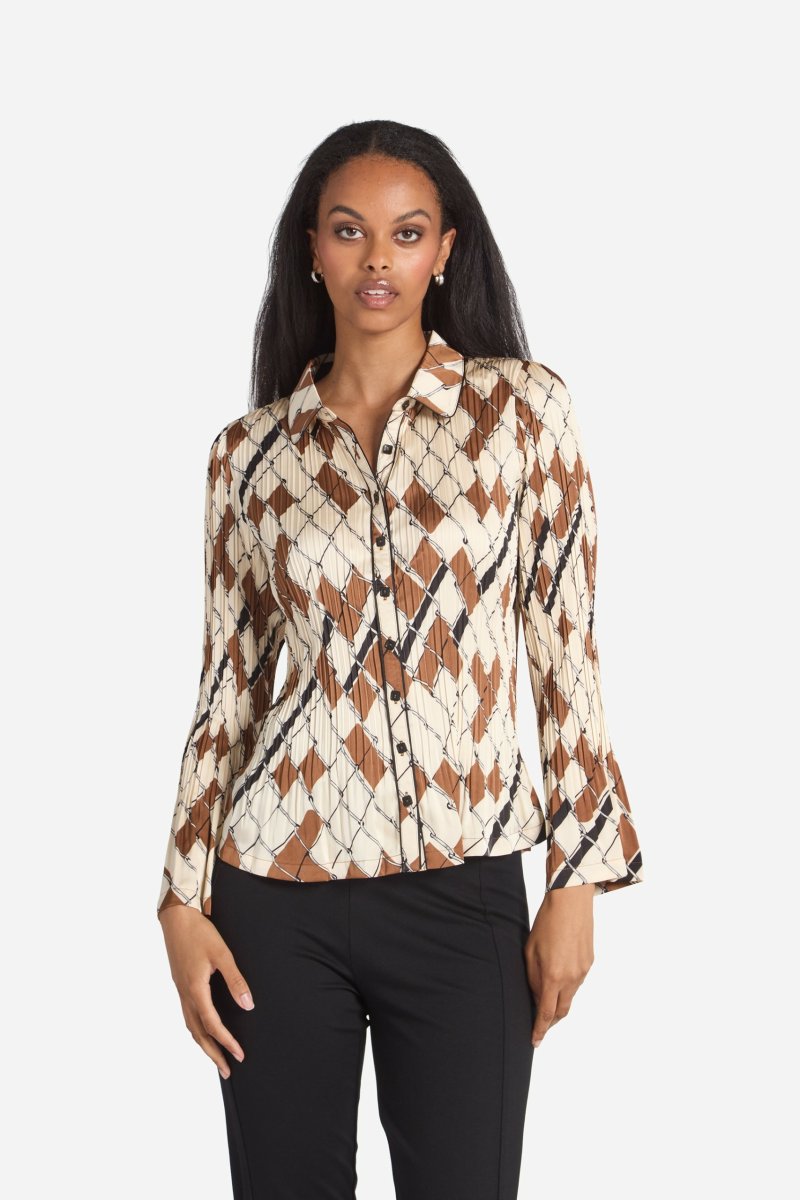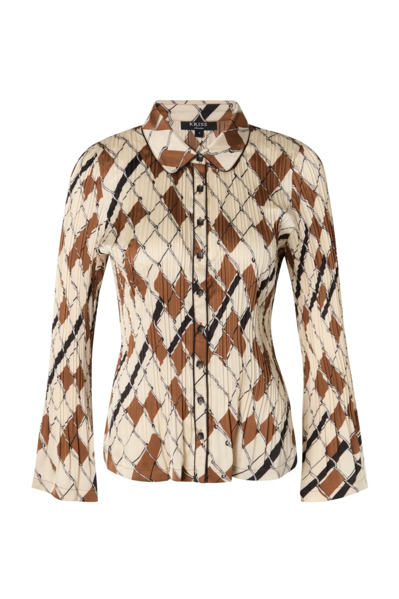 Plisserad blus med tufft print, blank yta och svarta detaljer. Blusen har en skjortkrage med en svart paspoal runt om, och knäpps med små knappar som sitter längs med knappslån som har svarta kanter. Modellen är något insvängd i midjan och släpper i plisseringen både runt höft och stuss och i nederkanten av den