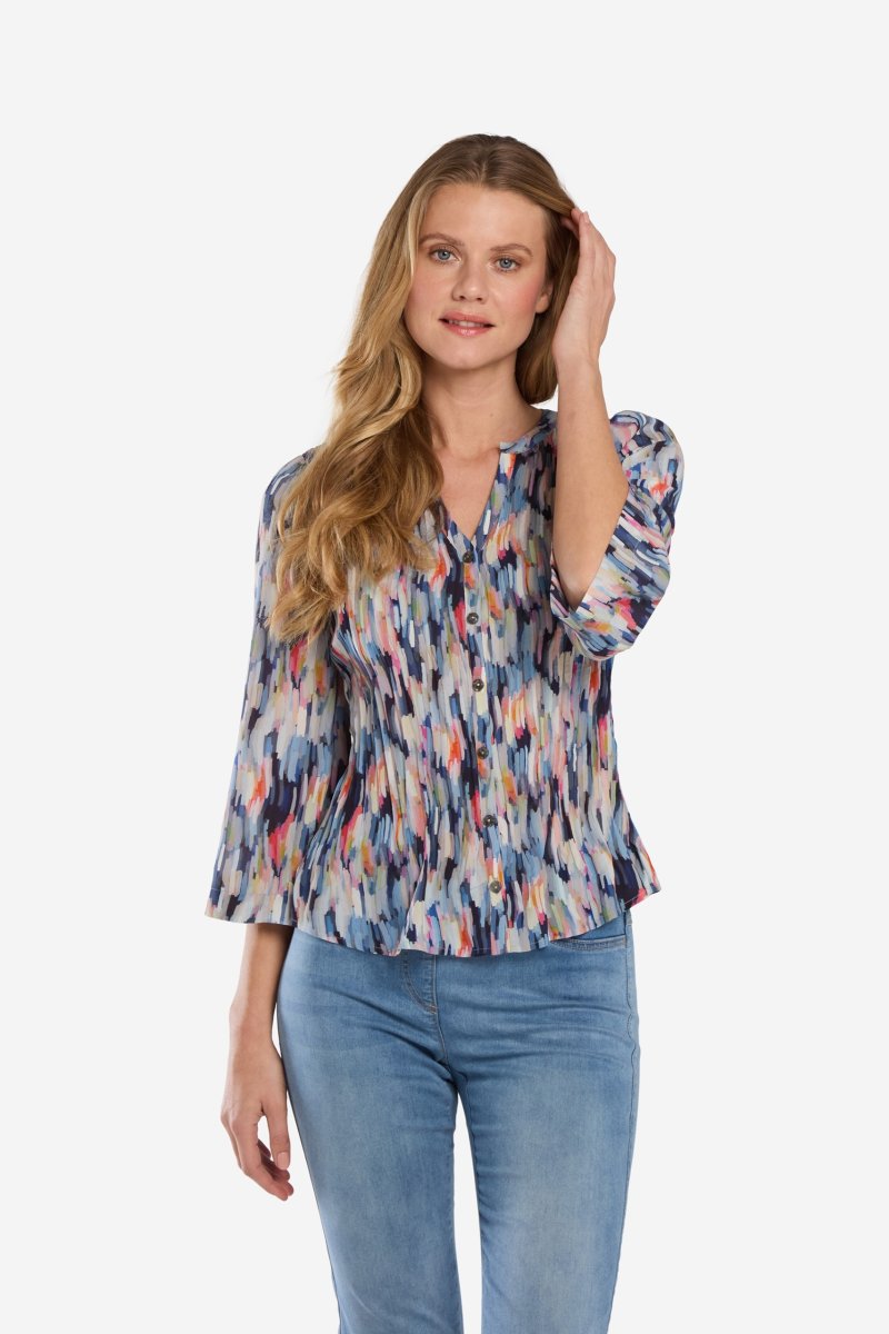 Plisserad blus i mjuk chiffong med vackert print. Smal ståkrage vid den V-formade halsringningen, som sedan fortsätter ner i knäppkanten mitt fram. Diskreta knappar till stängning mitt fram. Modellen är plisserad men släpper i plisseringen över höft och stuss. Halvång, vid, utstruken ärm. Den totala längden i storlek S är 61 cm från den högsta punkten.