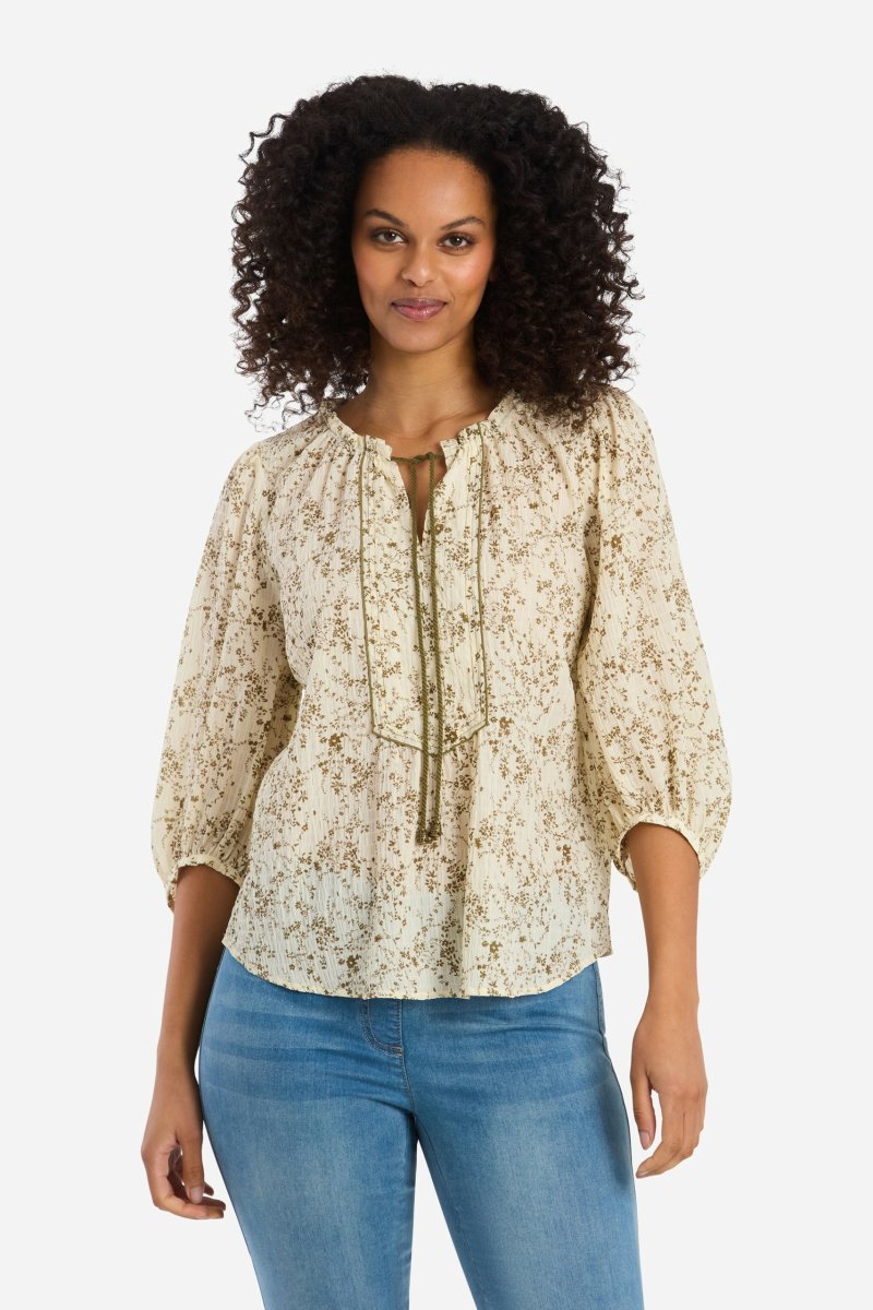 Blus med småblommigt khaki print i en tunn bäck och bölja kvalitet. Modellen är rak i passformen och har en mellanlång ärm med smalt kantband samt knapp och töjbar loop nertill. Rund halsringning med en sydd kanal och en tvinnad snodd i, som avslutas med metalldetaljer nertill. Under knytfunktionen finns ett V-sprund fram och ett frack ok över byst, markerat av en enfärgad paspoal runt om. Omlott funktion vid halsen baktill, vilken går ner till en avskärning i midjan. Den totala längden i storlek S är 61 cm från högsta punkten.