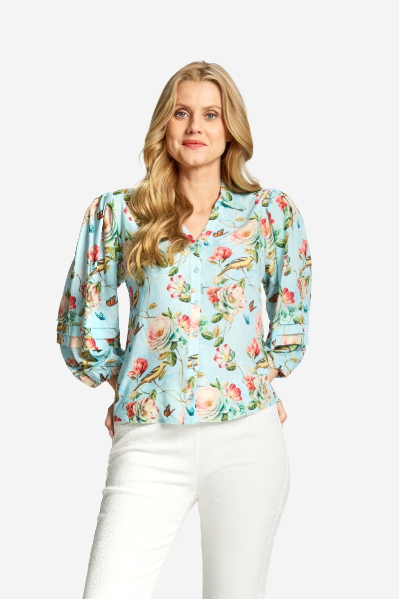 Viskosblus med blommigt print och vackra detaljer. Rak passform med något insväng midja och mellanlång ballongärm med breda veck mitt på, samt resår nertill. Skjortkrage och V-formad halsringning med ett kantband, som fortsätter ner som knäppkant mitt fram. Knäppning med diskreta knappar. Dekorativt ok på övre delen av ryggen, och något rundad nederkant. Den totala längden i storlek S är 64 cm från högsta punkten under kragen.