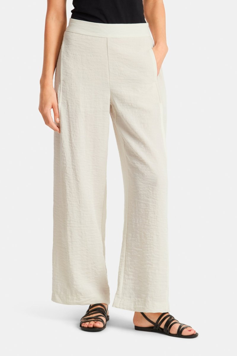Vid byxa i en viskosblandning med snygg, hamrad struktur i tyget. Brett midjeband framtill och resårband bak. Snedskurna fickor i sidan och markerade sidsömmar som även återfinns baktill på benet. I den vita färgställningen så är övre delen av byxan fodrad med ett beigefärgat foder. Längden på insida ben är 66 cm. Passar bra till Jacka Bessie i samma färg.