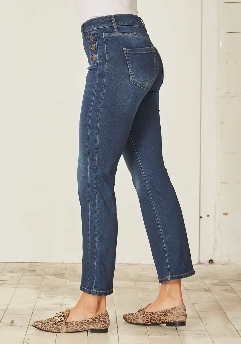 Como Button Jeans är det perfekta valet för dig som älskar eleganta och unika jeans. Dessa jeans har en vacker design med fina knappar på varje sida av höften, vilket ger en feminin touch. De har även en trendig flare-effekt vid ankeln, vilket skapar en smickrande silhuett. Como Button Jeans är designade utan framfickor, men med en extra söm på utsidan av varje byxben, vilket tillför en spännande detalj. De har en mellanhög midja och är tillverkade i stretchigt tyg, vilket ger en fantastisk passform och komfort. Como Button Jeans är jeans som du kommer att älska att ha på dig!