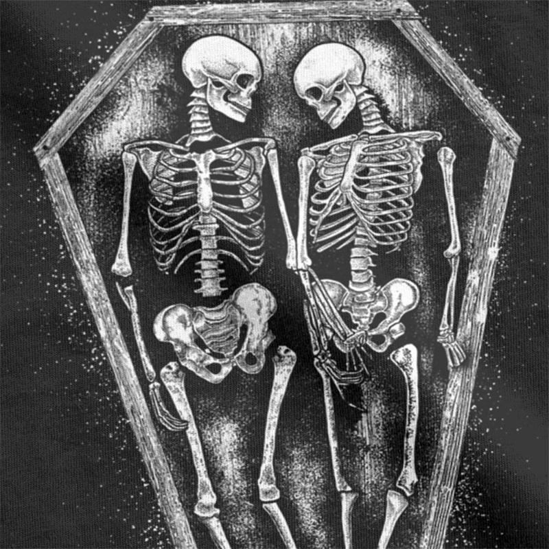 Tröjans design utgörs av två kära skelett som ligger i en kista. De båda skeletten håller varandras händer. Baksidan på tröjan är svart utan motiv.