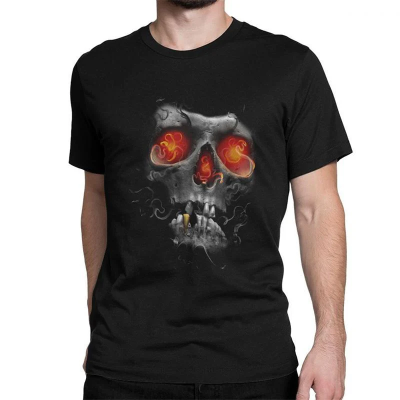 Trendsäker T-Shirt Med Dödskalletryck som föreställer en Dödskalle som nu i dödsriket tycks ha fått Röda Ögon. ”Den fege dör tusentals gånger, den modige dör bara en gång.”