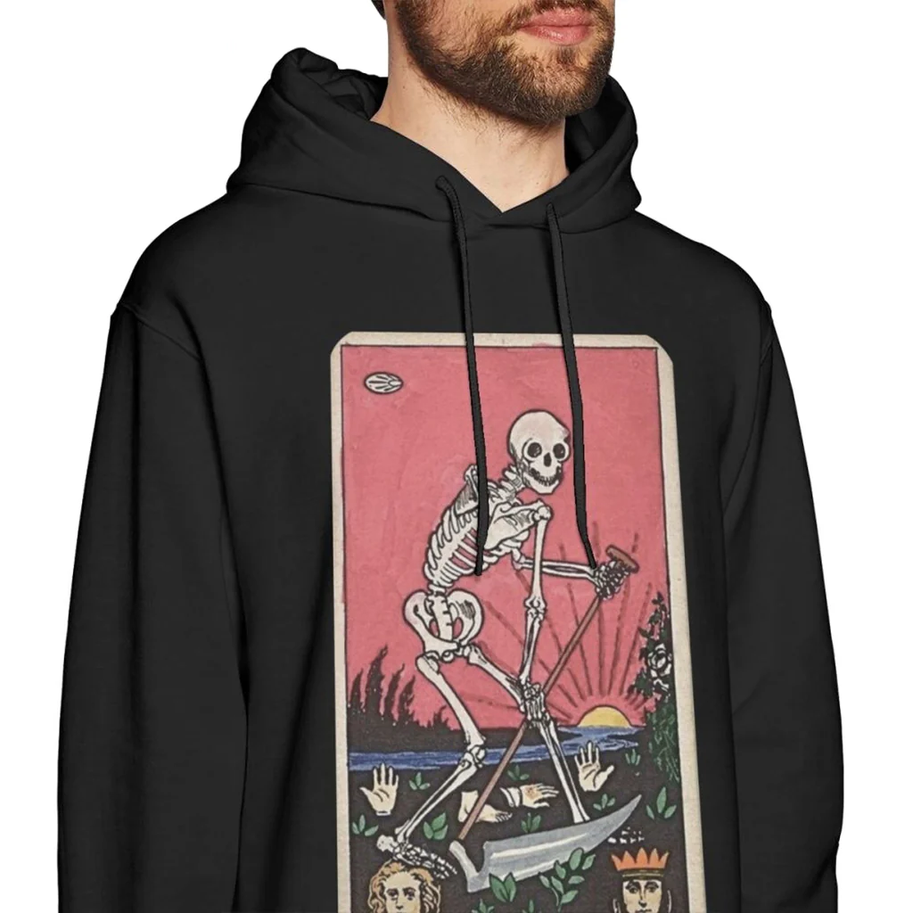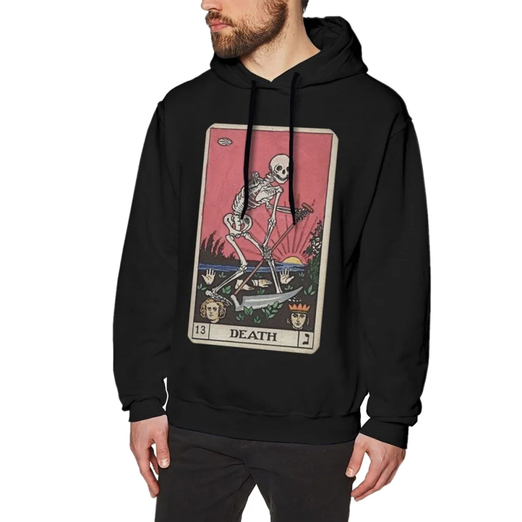 Det här är en svart dödskalle hoodie med luva och justerbara band. Tröjan är producerad i en mjuk bomullskvalitet av 100% bomull. Huvtröjan har motivet Death Tarot Card tryckt på bröstet.