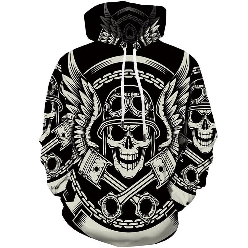 Det här är en snygg dödskalle hoodie med luva och justerbara band. Tröjan är producerad i en mjuk polyesterkvalitet gjord av 90 % polyester och 10 % spandex.