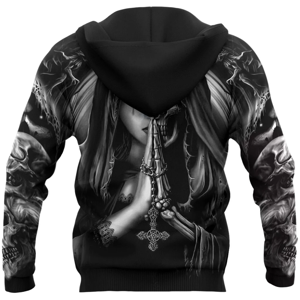 Tröjan är svart och har motivet Gothic Prayer tryckt på plagget. Motivet föreställer en bedjande tjej som till hälften består av ett skelett. Tjejen håller ett upp-och-nedvänt kors med ett pentagram i sina händer, och på ärmarna finns det tryckt flera rykande dödskallar. Motivet är tryckt på både framsidan och baksidan av plagget.