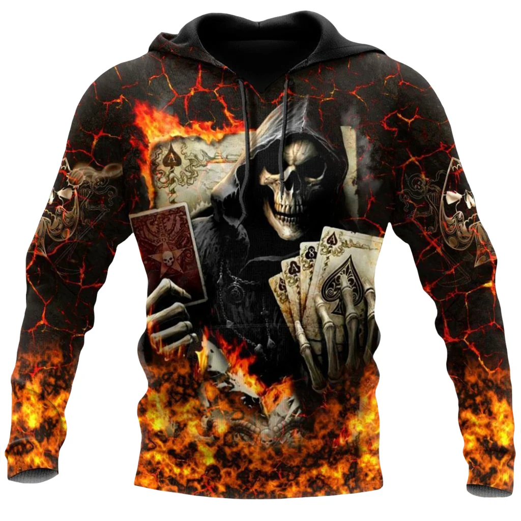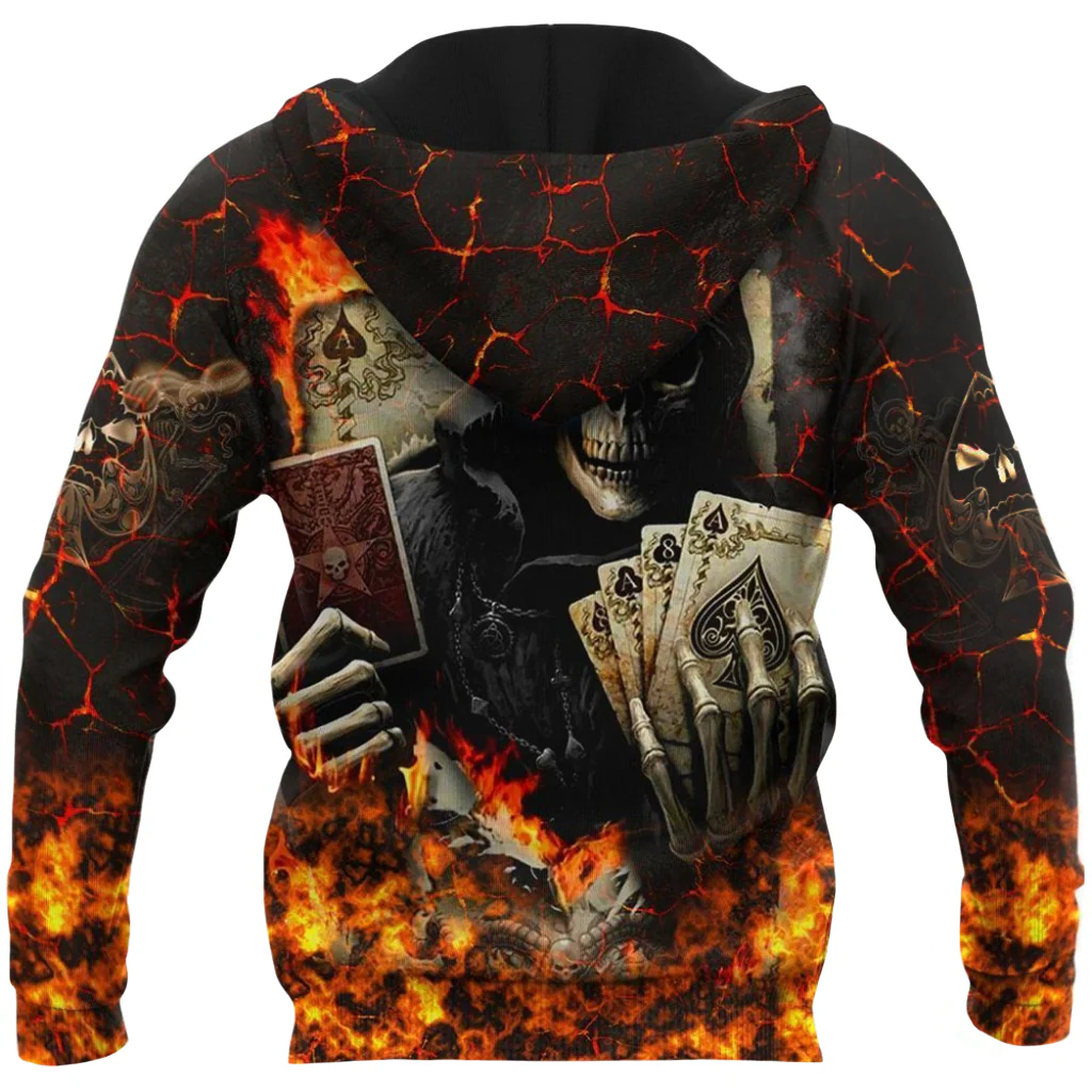 Tröjan är svart och har motivet Poker Reaper tryckt på plagget. Motivet föreställer Liemannen i kåpa som håller upp några spelkort i handen. Runt honom syns ett brinnande inferno. På ärmarna syns spader ess med en dödskalle i mitten.