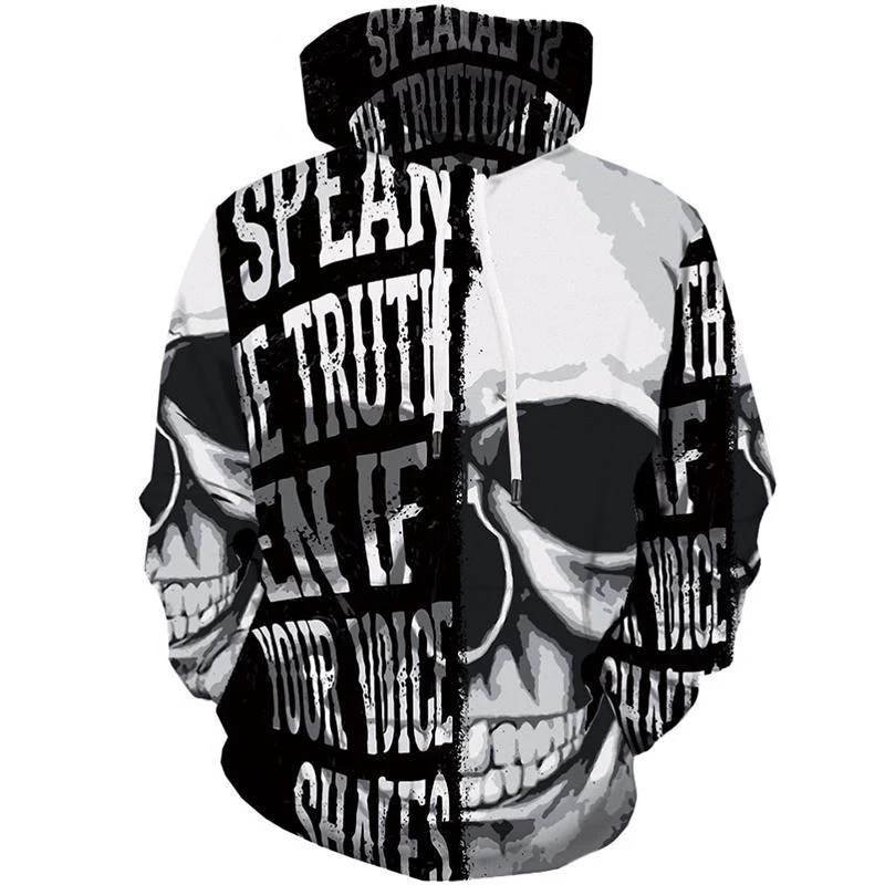 ”Släng ur dig sanningen även när din röst darrar.” Denna innebördsrika Dödskalle Hoodie är inte designad för de svaga eller skygga. Vilket läger tillhör du?