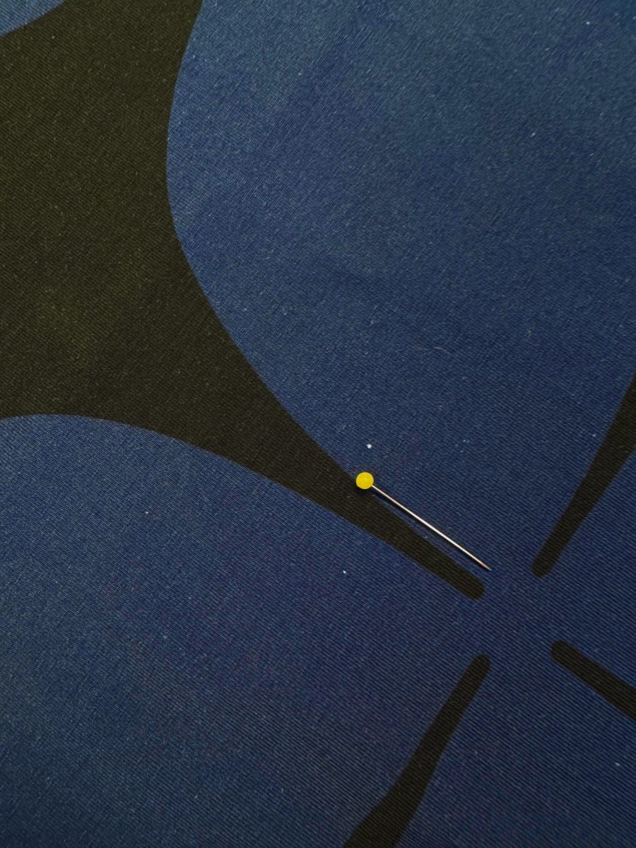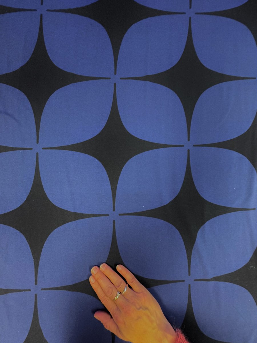 Material: Gotsmärkt ekologisk bomull 95% och lycra 5%. Motiv: svart/blå stormönstrad. Obs det kan finnas små små vita miniprickar i trycket. se bilder. Närbilderna visar dock inte färgerna korrekt. Färger kan variera på skärmar men bild 1 (alla 3 tygerna) är tagen utomhus och mest korrekt.