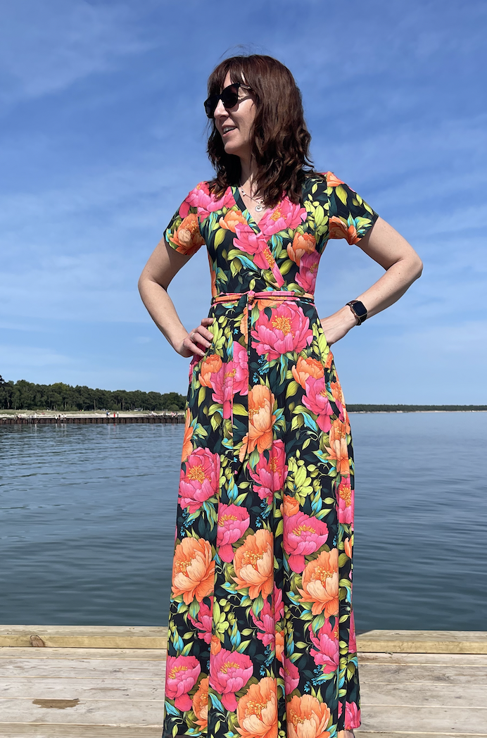Modellbilderna visar klänningsmodellen i annat tyg. På första modellbilden (med 3/4 dels utställd ärm) visas stl 38/40, på nästa (bryggan) har modellen stå 36/38, och sen är det stl 46/48 (på den bilden är ärmen ofållad). Vi har valt att sy denna klänningen dubbelstorlekar eftersom modellen är flexibel. Väljer du mellan två storlekar ta den större, midjan är något lägre på denna modell än de flesta av våra klänningsmodeller vilket gör att kjoldelen (som är klockad) blir lite mindre över magen. Skärpet är löst utan hällor och kan knytas över sömmen, i håret eller kanske på väskan?