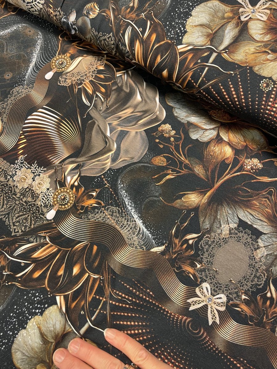 Material: Trikåtyg brun/guld tryckt i Europa. 95% ekologisk bomull och 5% elastan.
