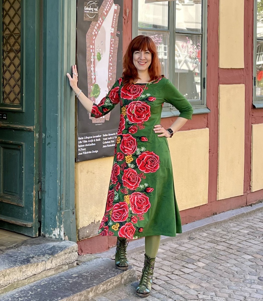 Material: Trikåtyg designad och tryckt i Europa. Oekotex, 95% bomull och 5% elastan .Halsrigning och ev fickor kantas med kantband i samma mönster som klänningen. Ärmsluten har inga kantband utan fållas som nedankanten av klänningen (söm).