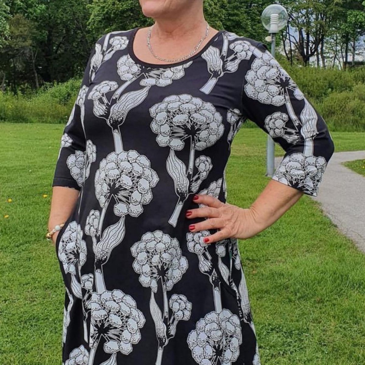 Halsrigning och eventuella fickor kantas med sammat tyg som klänningen dvs ej enfärgat.