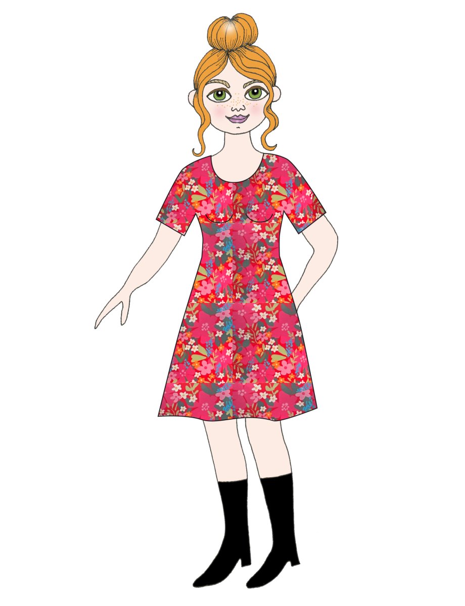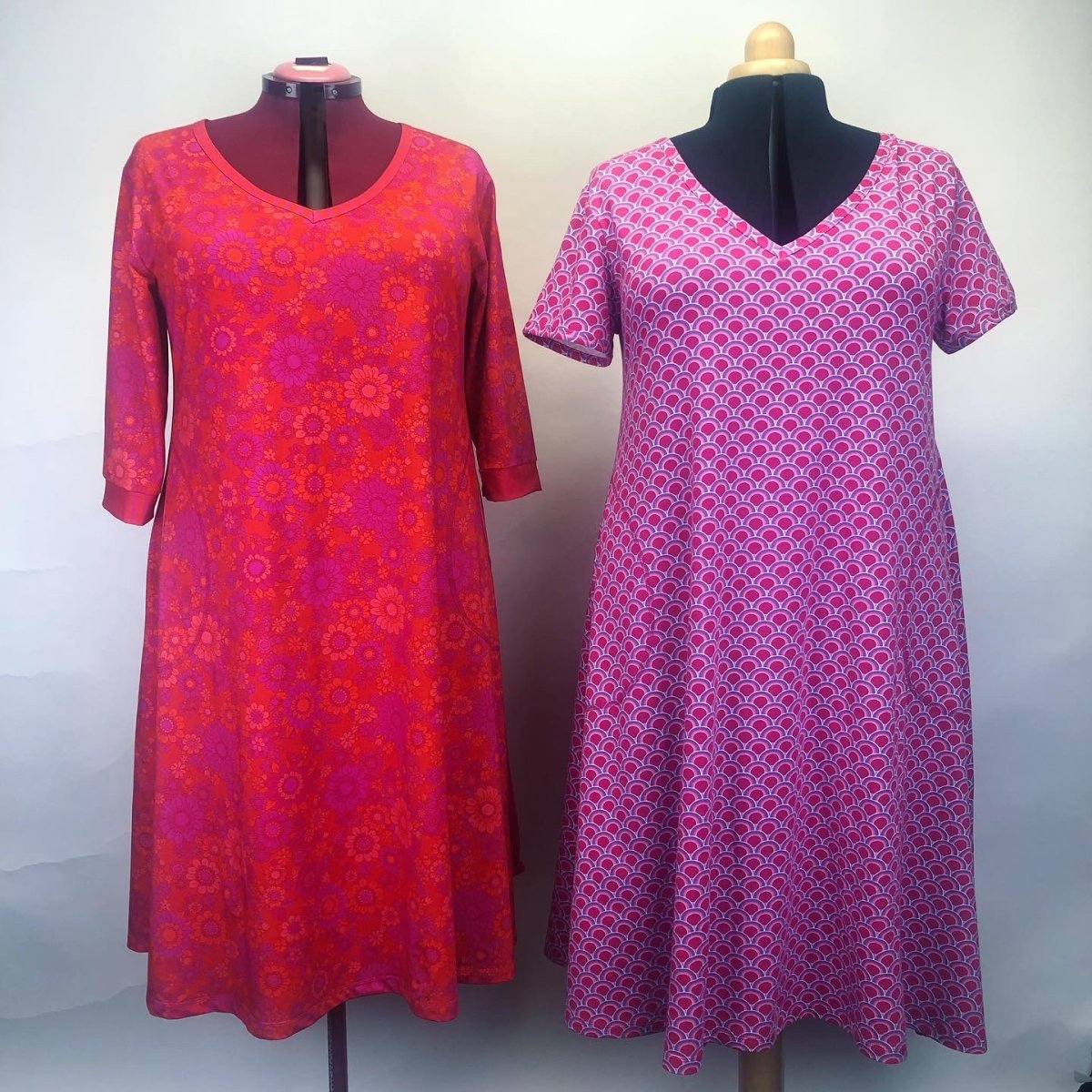 Bilderna på uppsydda klänningar visar andra tyger, detta gäller rödblommiga tyget ”Sweet Jenny” bild 1 och 2.