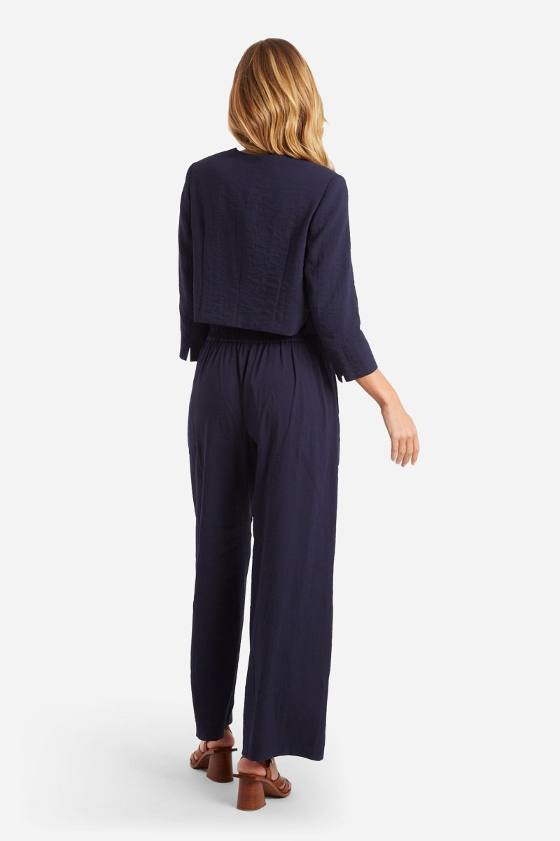 Fodrad bolero/ jacka i en viskosblandning med crepe struktur i tyget. Rund halsringning och något figursydd passform med slitsar i sidan nertill. Stängning med en hake och hyska vid framkanten upptill. Jackan har 3/4-lång ärm med slitsar nertill och en liten axelvadd. Den totala längden i storlek S är 47 cm från den högsta punkten. Passar bra ihop med Byxa Belia i samma serie.