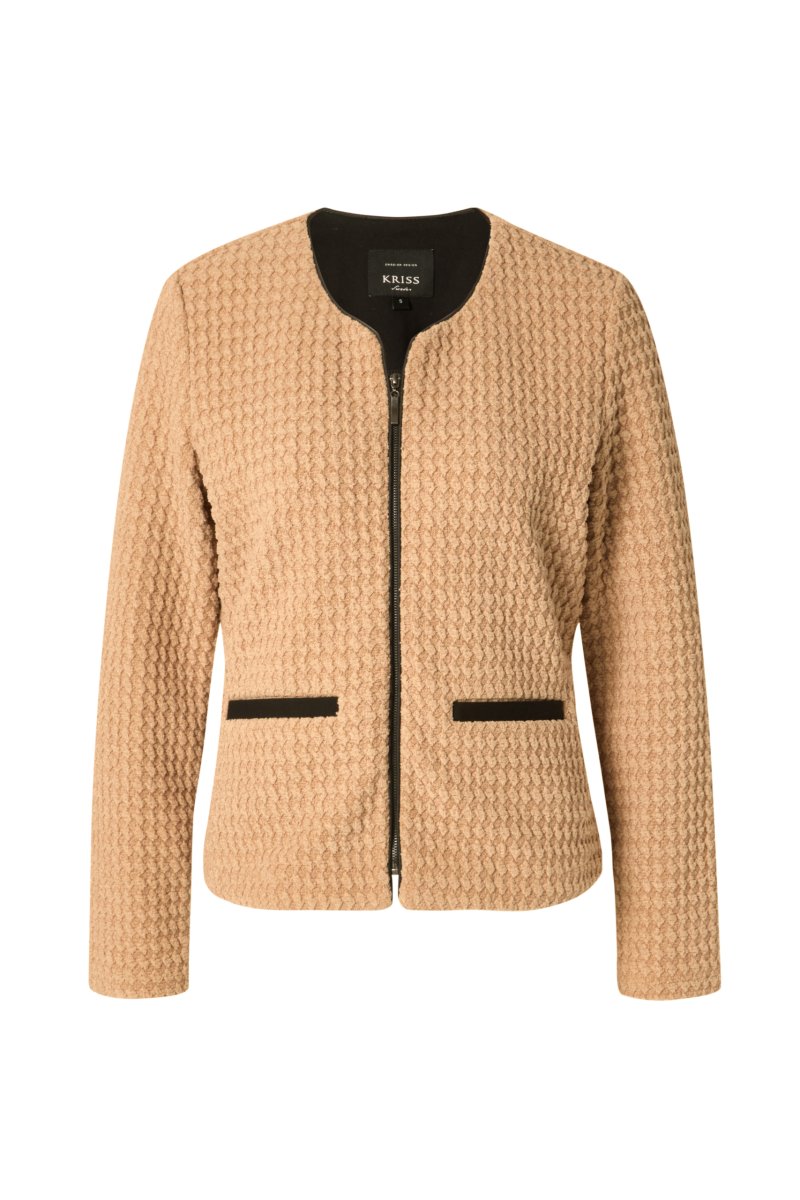 Ofodrad jacka med bubblig struktur i ett behagligt material som är mjukt och följsamt. Passform med något insvängd midja, lång ärm och fickor med svart kantband framtill. Rund halsringning med bred fåll på insidan av halsen och en svart paspoal som kant. Blixtlås till stängning i mitten fram, även den med en svart paspoal intill. Modellen är lite kortare och längden i storlek S är 57cm från högsta punkten. Modellen på bilden är 178 cm lång.