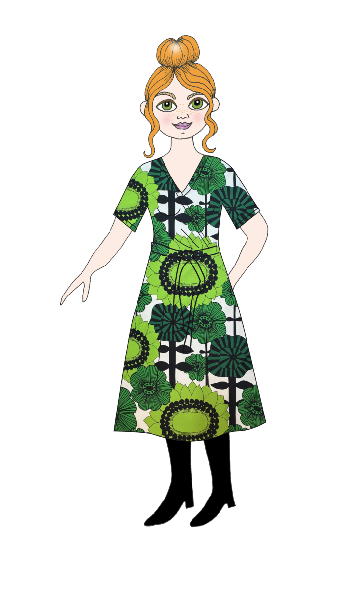 Astrid omlottklänning i tyg Albertina grön, har fastsytt omlottliv, kanten i rigningen är ganska fast så du själv kan avgöra hur urringad du önskar ha klänningen för tillfället, en omlottmodell som är lika fin på liten byst som stor. Avtagbart knytskärp ingår. Fickor går att lägga till mot pristillägg (200:-) Väljer du fickor sys dessa mot framstycket för att ligga fint mot höften utan att bli klumpiga.