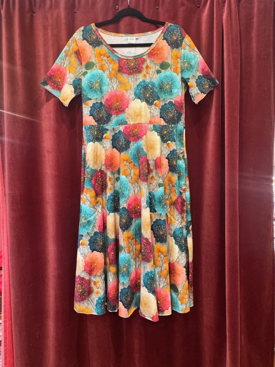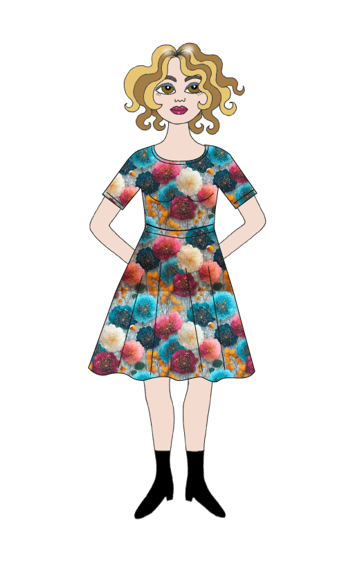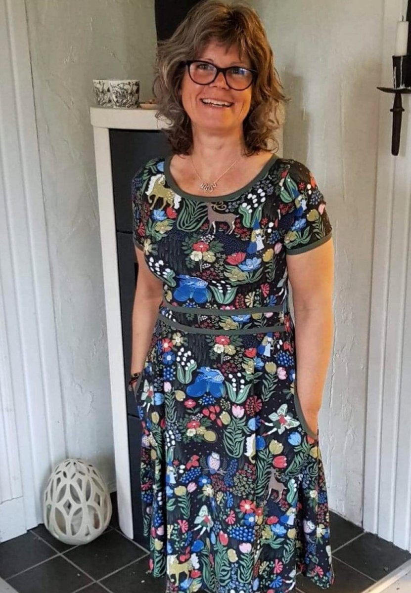 Material: Trikåtyg designat och tryckt i Europa. ekologiskt GOTS, 95% bomull och 5% elastan. Halsrigning och ev fickor kantas med kantband i samma mönster som klänningen. Ärmsluten har inga kantband utan fållas som nedankanten av klänningen (söm).