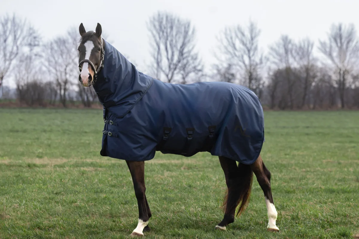 Täcket har en elegant navyblå design med klassiska Kingsland-detaljer, vilket gör det lika snyggt som praktiskt – perfekt både i stallet och under transport.