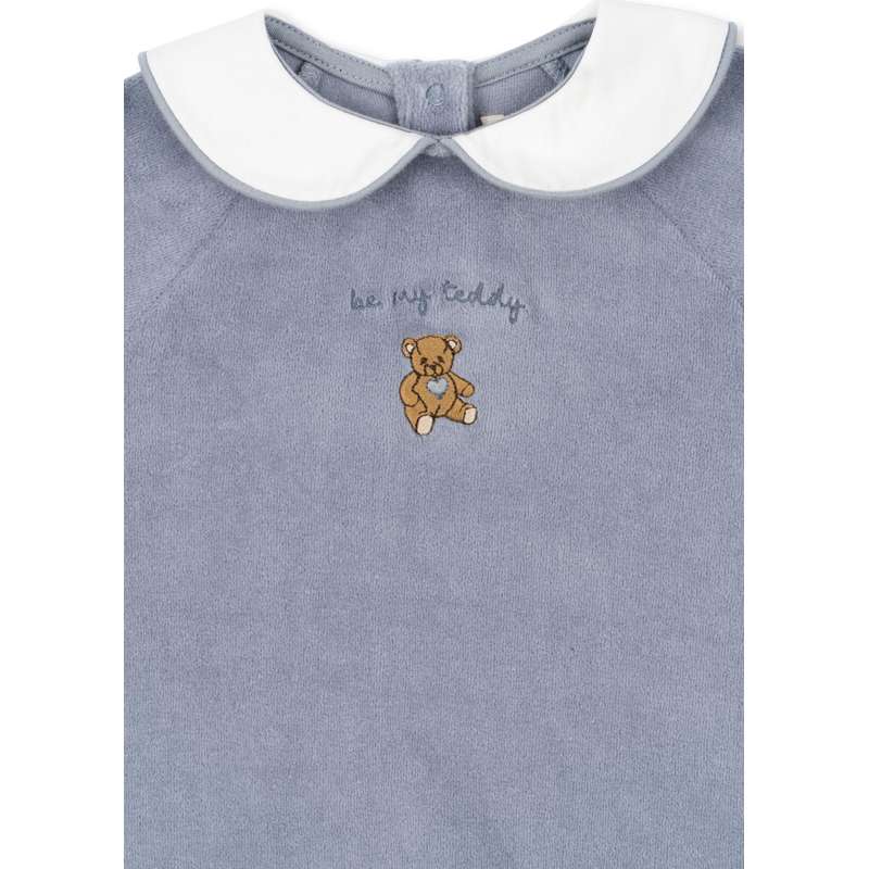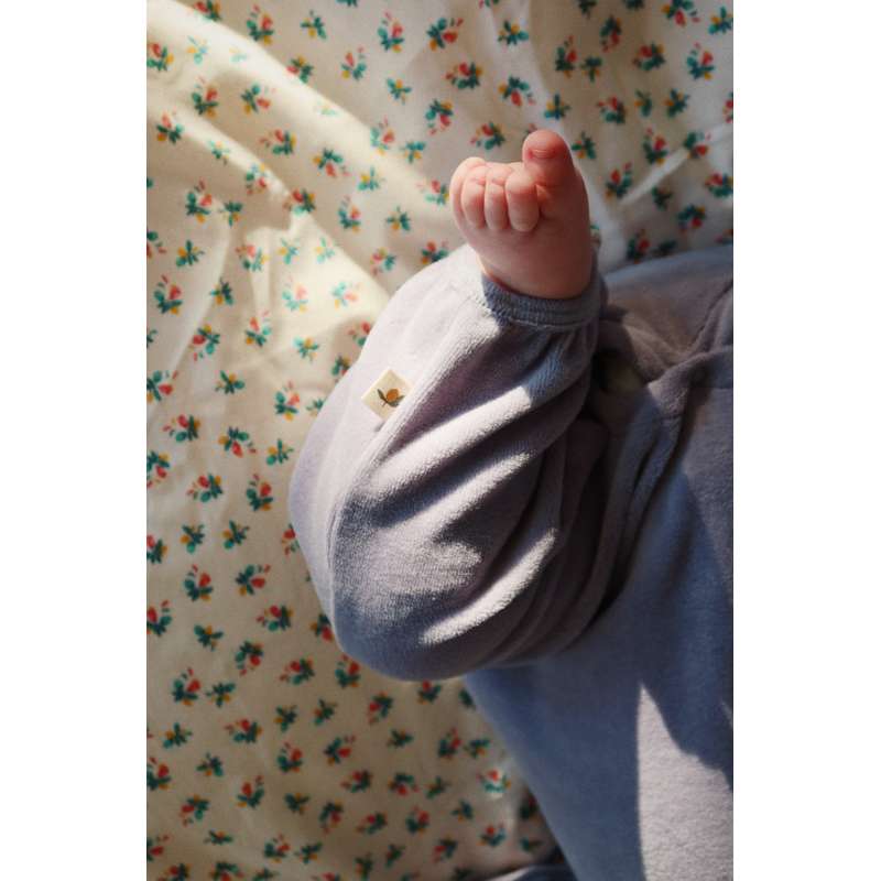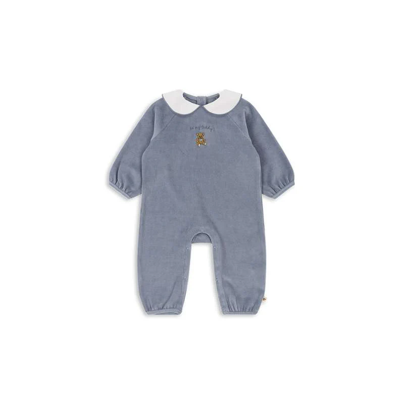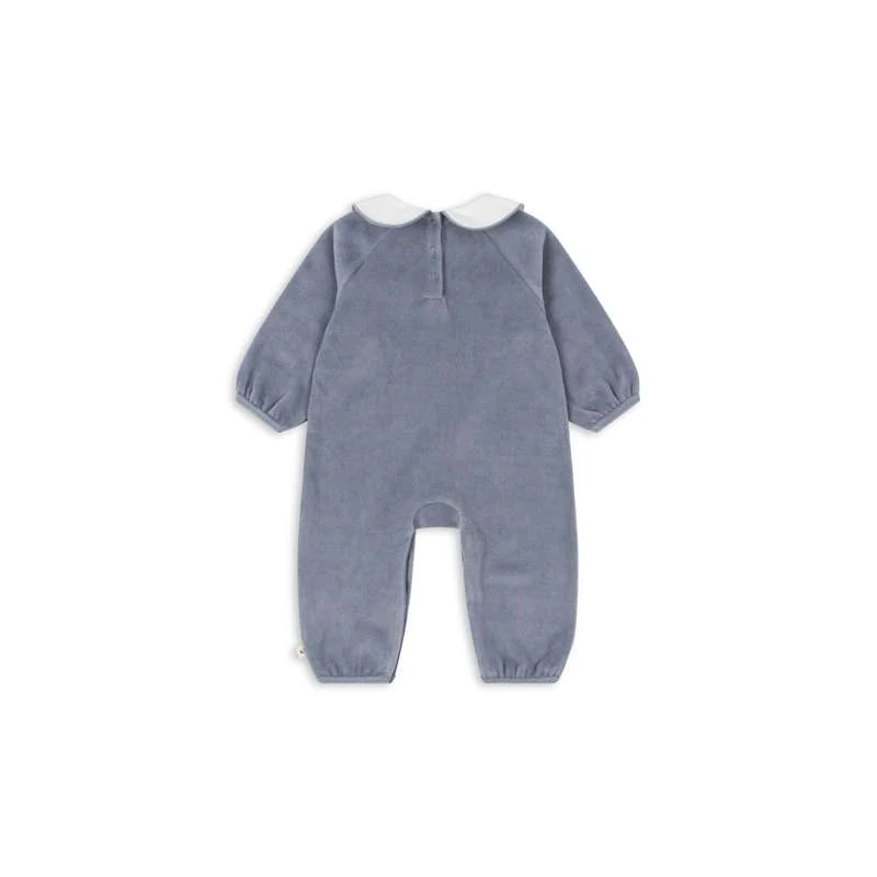 Mjuk sammetsoverall med en dekorativ krage och broderi på bröstet. Tillverkad av 80% ekologisk bomull och 20% återvunnen polyester. GOTS, tillverkad med 80% ekologiska material, certifierad av CU 1094701.