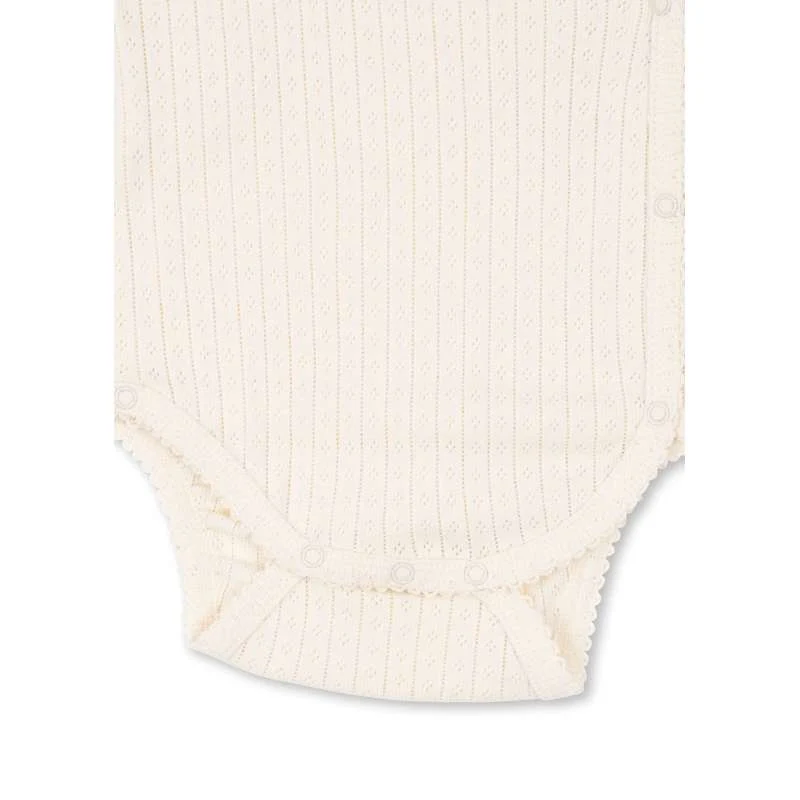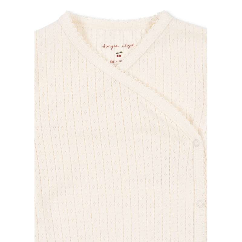 Mjuk kropp med dekorativ pointelle och lätt omslagsstängning. Tryckknappar längs kroppen och gren för enkel påklädning. Tillverkad av 100% ekologisk bomull. GOTS, Ekologisk, certifierad av CU1094701.