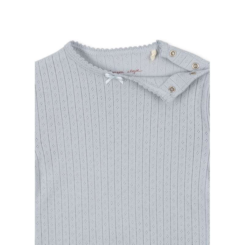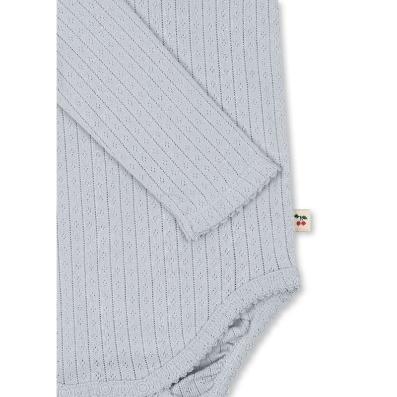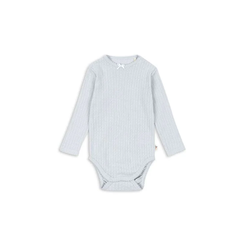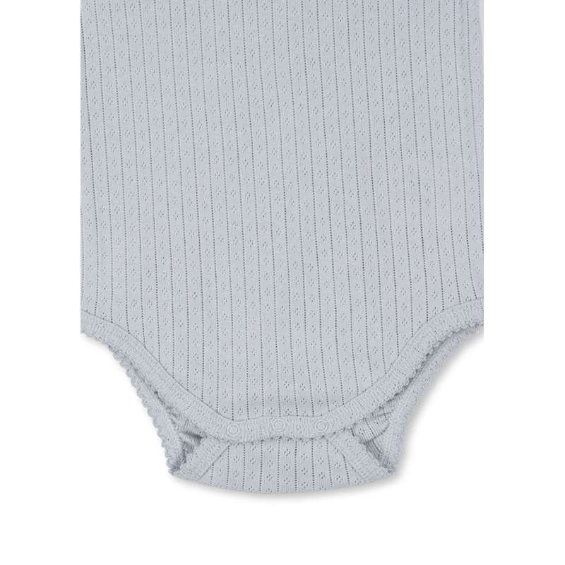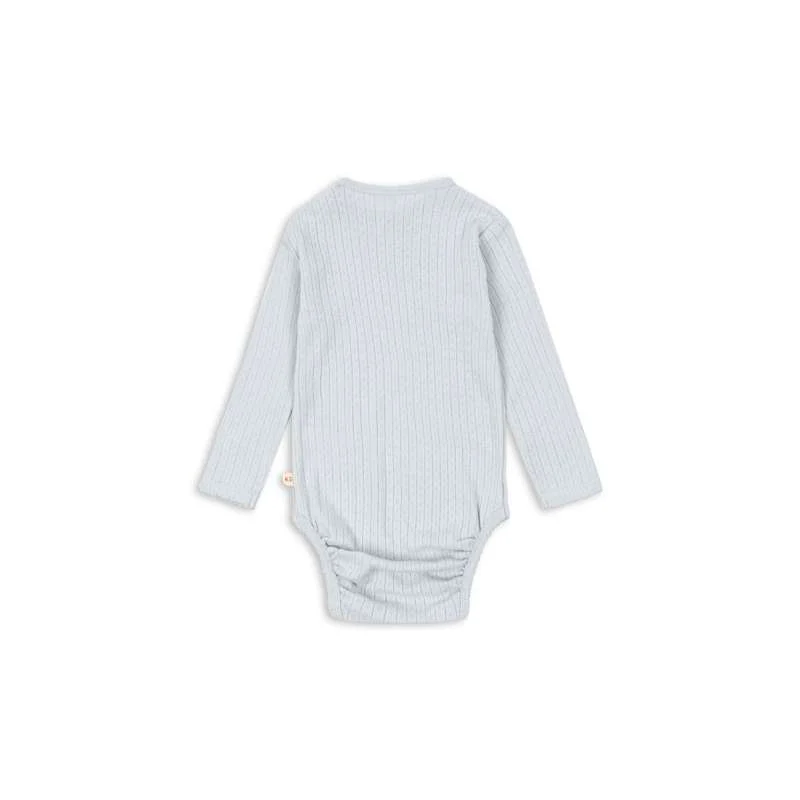 Mjuk bomullskropp med dekorativ punktstickning. Tryckknappar vid grenen för enkel påklädning. Tillverkad av 100% ekologisk bomull. GOTS, Ekologisk, certifierad av CU1094701.