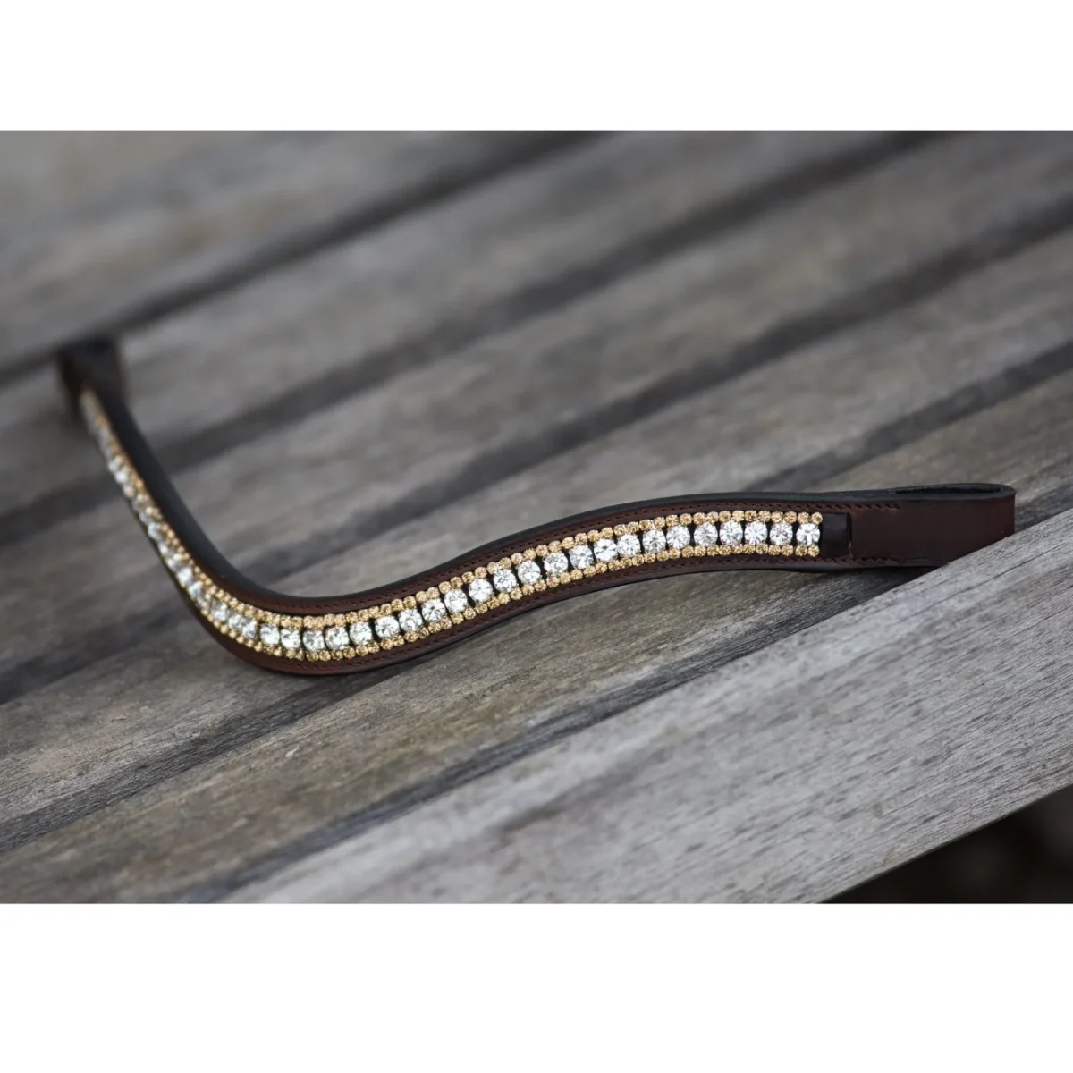Svängt pannband med tre rader av silverfärgad och guldfärgad strass från Jacson Cary som passar dom flesta träns.