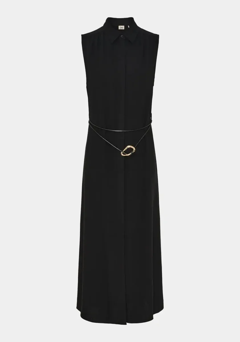 Den är ärmlös med en klassisk krage och knappknäppning, vilket ger lite struktur till det mjuka fallet. Bär den löst för en avslappnad look, eller knyt bältet i midjan när du vill skapa mer form. Det smala bältet med den fina spänndetaljen ger den lilla extra touchen – utan att överdriva.