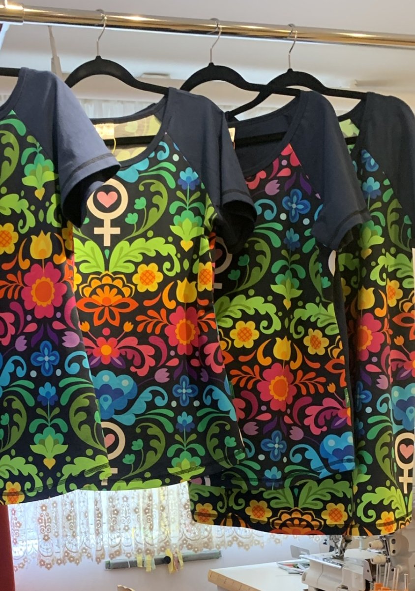 Tunikan har lätt rundad nederkant. Fint placerat kvinnotecken (mönstrat tyg även på bakstycket), mönsterplacering kan skilja mot bilden men vi lägger stor vikt vid en snygg placering av symbolen.