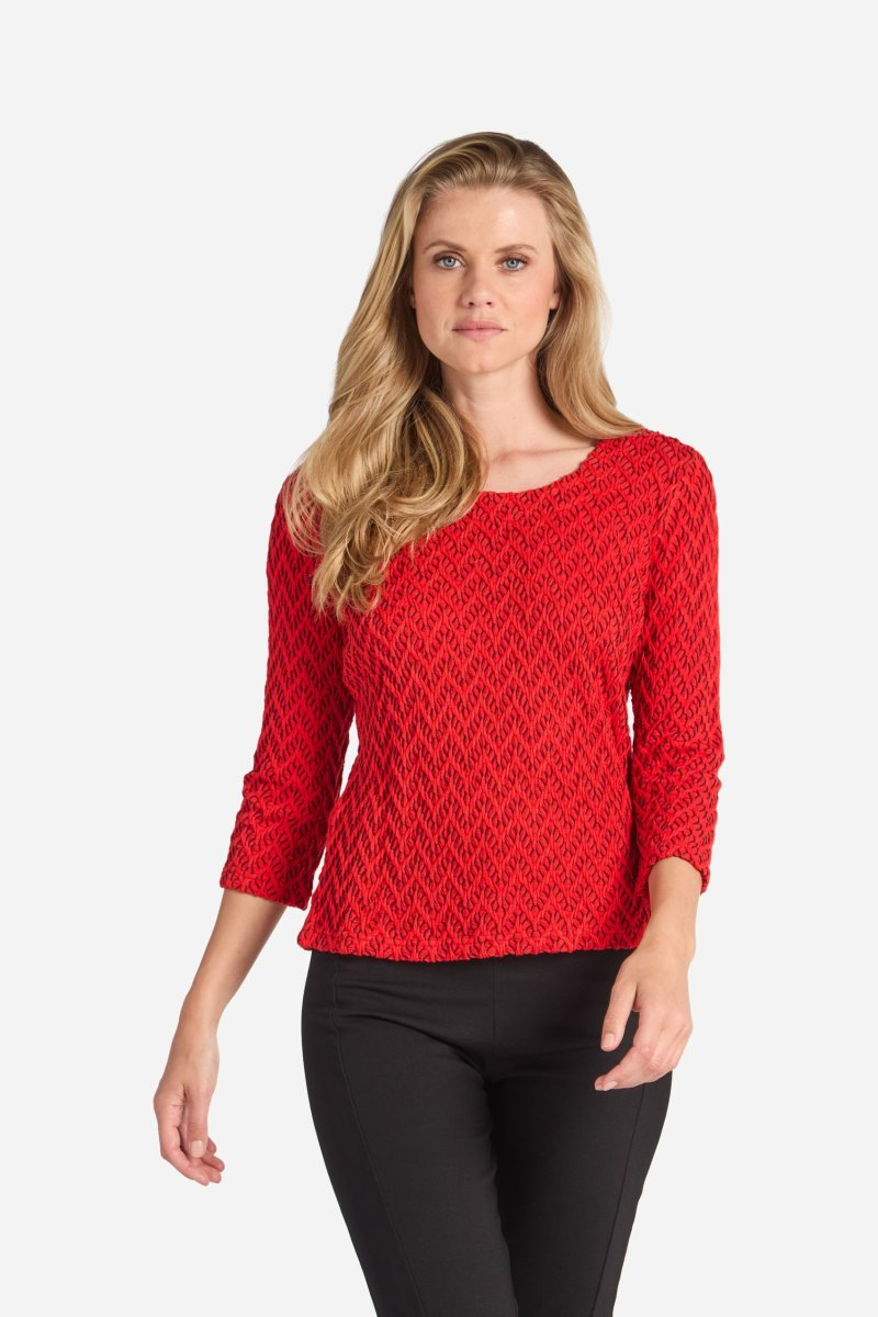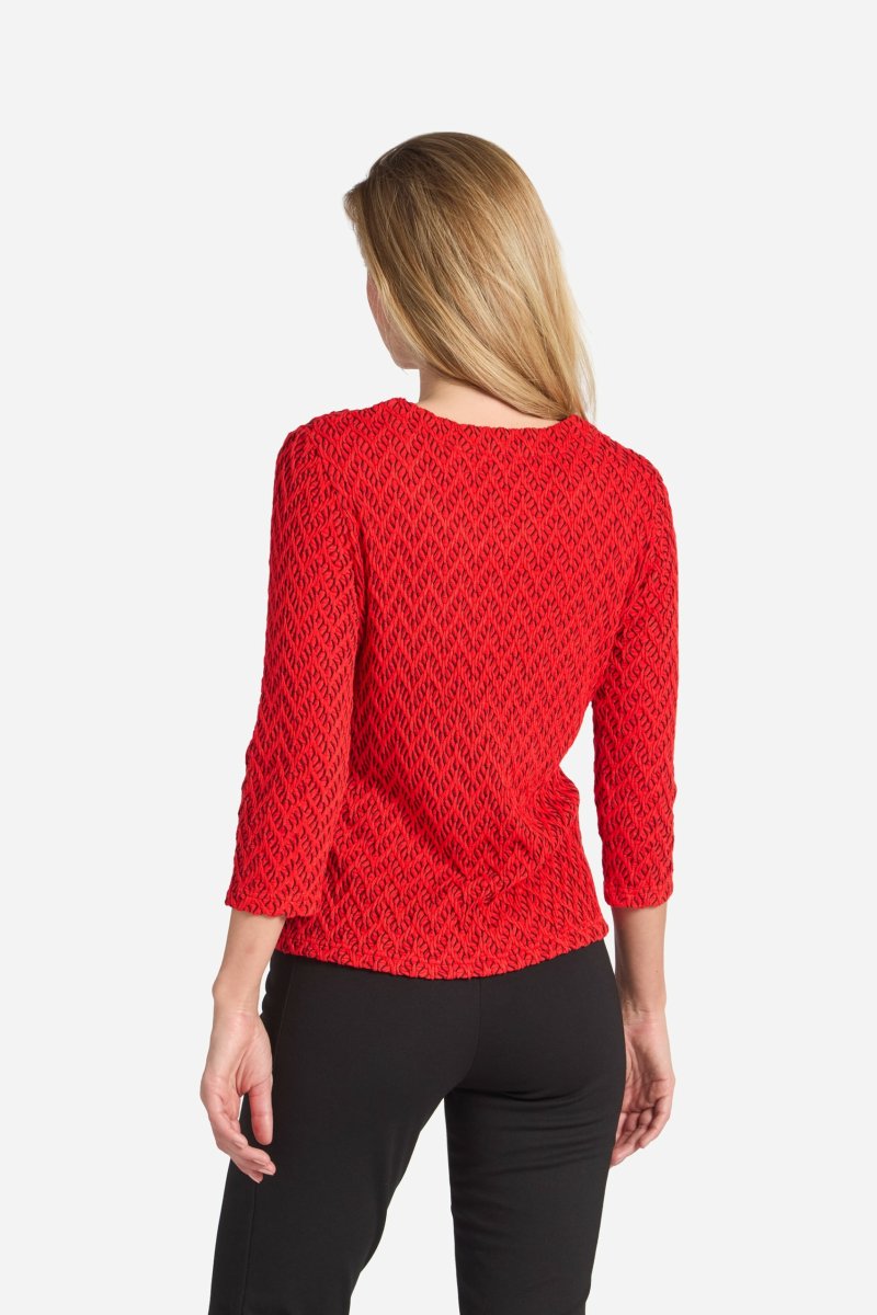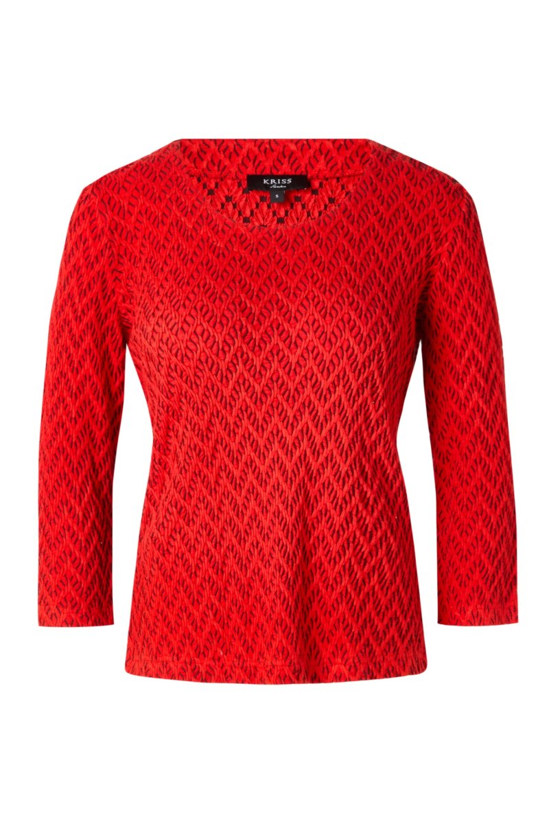 Underbar topp i ett mjukt och stretchigt material med vacker sicksack struktur. Klassisk passform med något insvängd midja, 3/4-lång ärm och en rund halsringning. Längden i storlek S är 59 cm från högsta punkten. Modellen på bilden är 178 cm lång.
