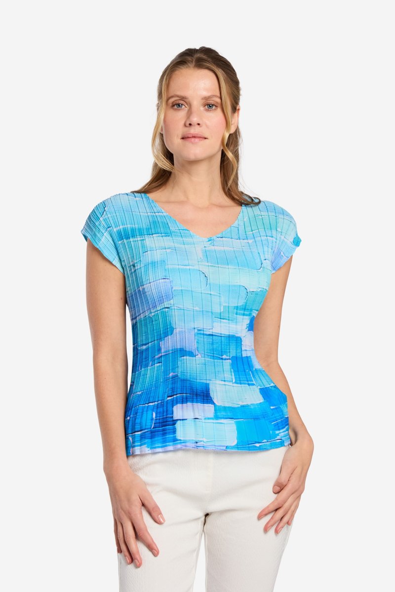 Plisserad topp med smidig kvalitet och abstrakt print på en matt botten. Svagt V-ringad halsringning och en liten holkärm som täcker axeln. Modellen är helplisserad och lättburen. Den totala längden i storlek S är 62 cm från den högsta punkten.