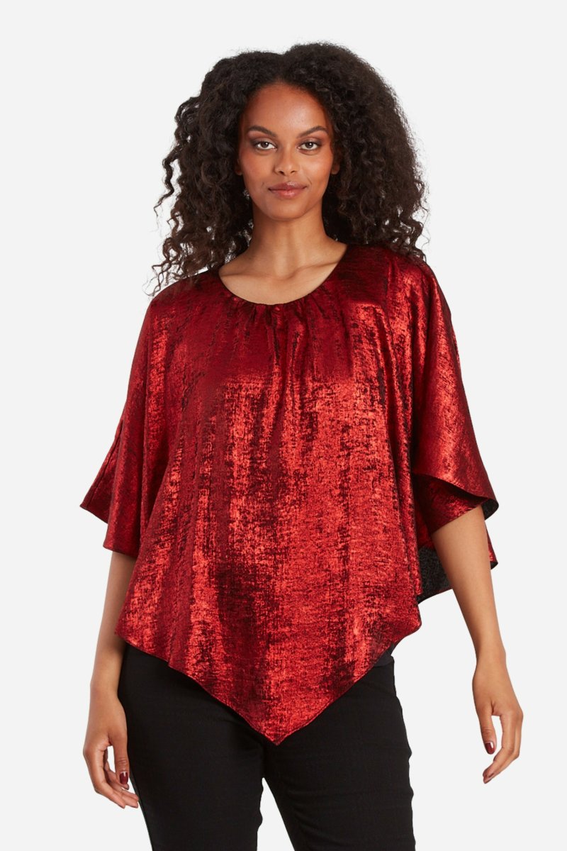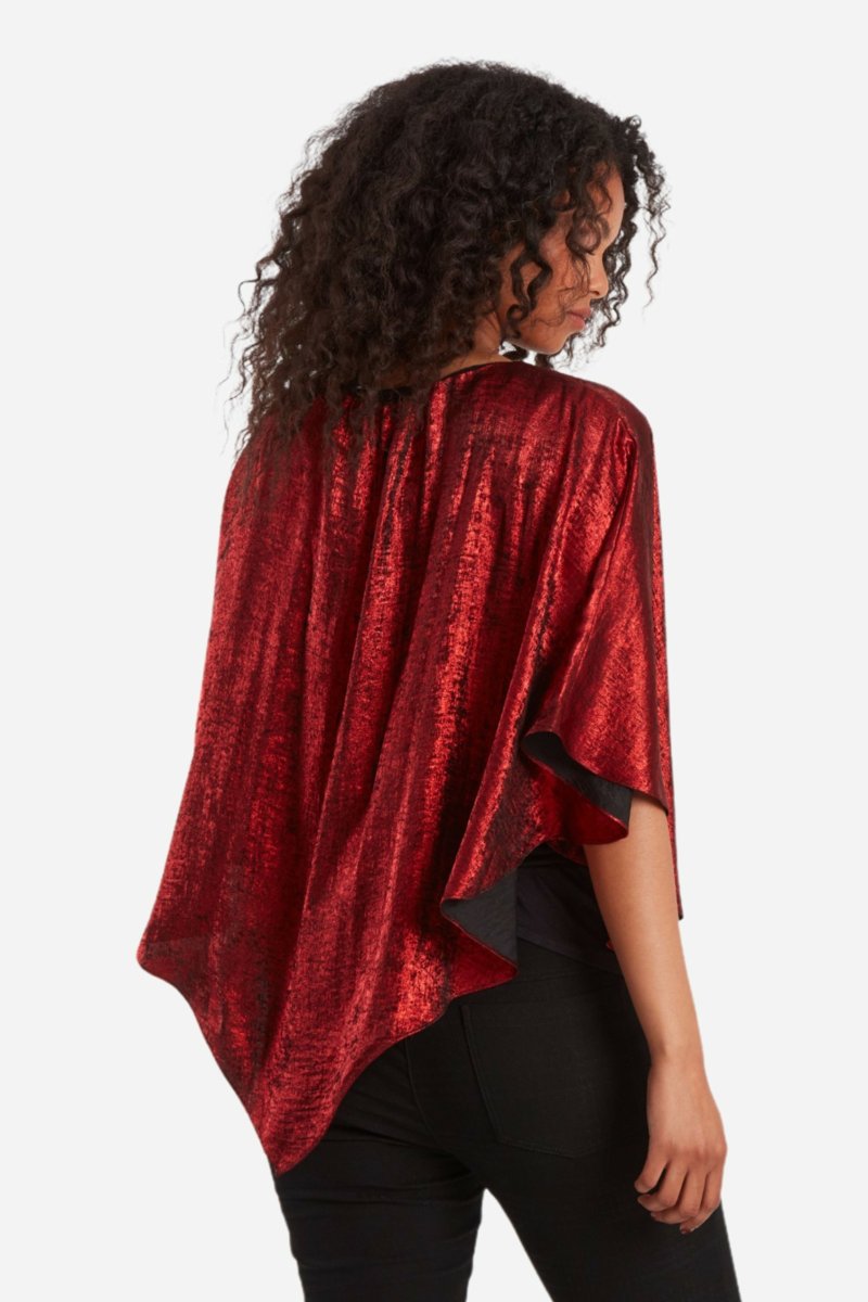 Generös blusmodell i metallic tyg som liknar en poncho i skimrande kvalitet. Denna är fodrad med ett mjukt och stretchigt viskoslinne i svart. Några stygn i midjehöjd på varsin sida av poncho-delen skapar ärmar. Blusen har rund halsringning med några veck i mitten, både fram och bak. Den totala längden i storlek S är 73 cm från den högsta punkten, och vidden från ärm till ärm är 108 cm.
