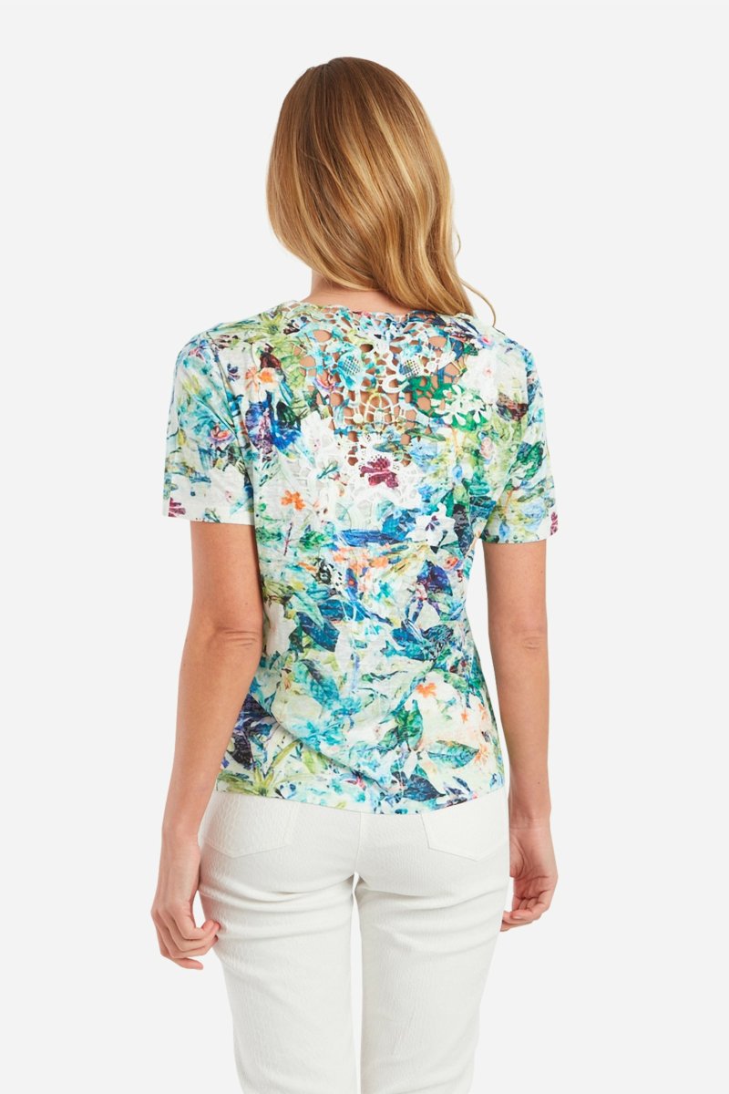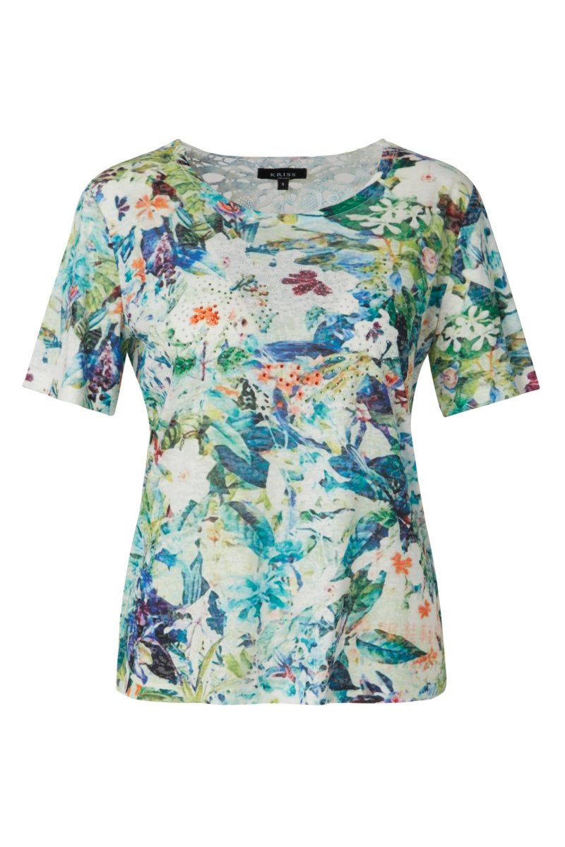 Vårig topp med blomprint och dekorationsstenar på övre delen framtill. Toppen är i en skön burnout trikå med printad spets på baksidans övre del, som går upp i den runda halsringningen. Modellen är något insvängd i midjan och den har en kort ärm. Längden i storlek S är 62 cm från högsta punkten.