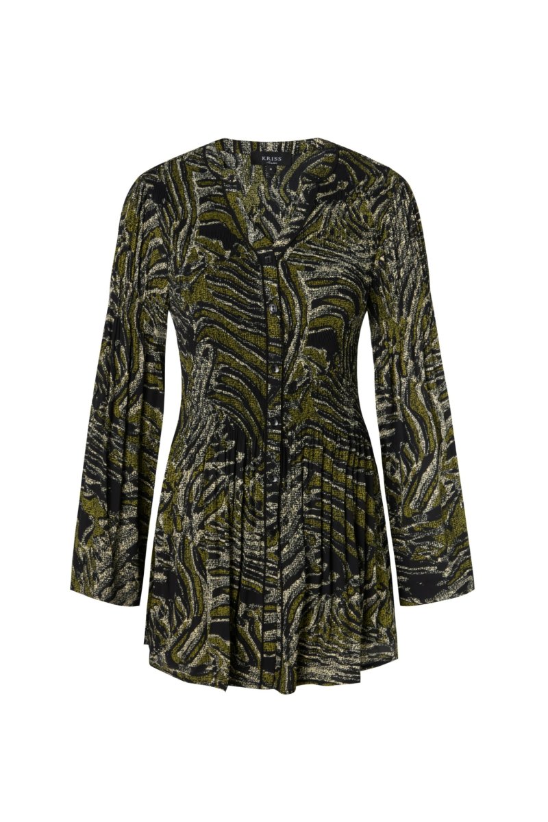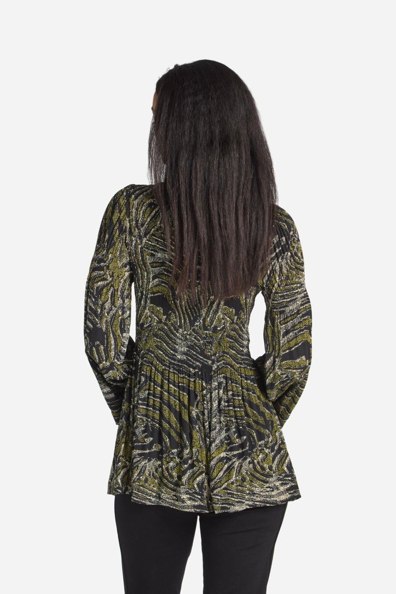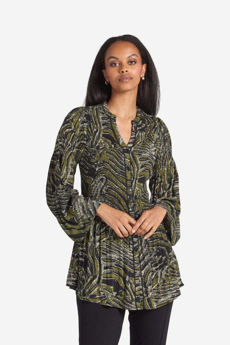 Tuff tunika med print och svarta detaljer. Plisserad kvalitet med en tätare plissering runt byst och liv och en lättare plissering nertill vilket ger tunikan ett snyggt fall runt stussen. Liten ståkrage med svart paspoal runt om, som går ner i en klädsam V-ringning och fortsätter ner i knäppkanten mitt fram. Knäppning med svarta, fyrkantiga knappar. Lång ärm med ett plisserat parti på överärmen och lättare plissering nertill samt en ärmslejf som formar ärmen vid användning. Den totala längden i storlek S är 78 cm från den högsta punkten. Modellen på bilden är 178 cm lång.