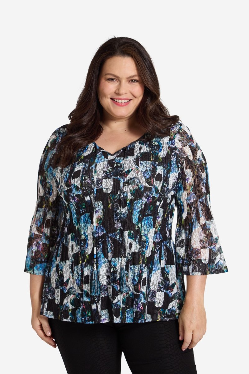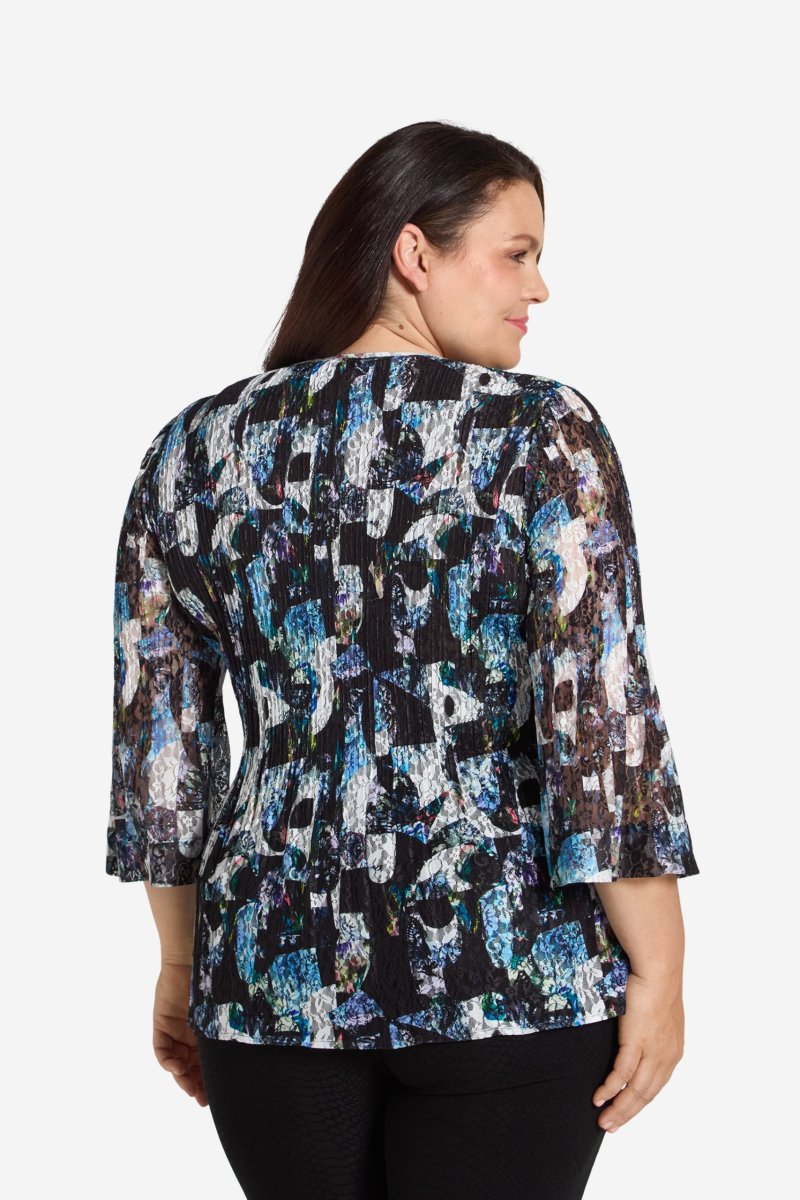 Plisserad tunika i printat spetstyg som är fodrad med svart mesh foder. Tunikan har en högt skuren rund halslinje med ett kantband som går över i två knytband mitt fram. Dessa avslutas med en metalldetalj samt en tofs i vardera ände. 3/4-lång ärm med vidd nedtill. Plisseringen släpper i tunikans nederkant vilket gör att den faller snyggt över stussen. Den totala längden i storlek S är 70 cm från den högsta punkten.