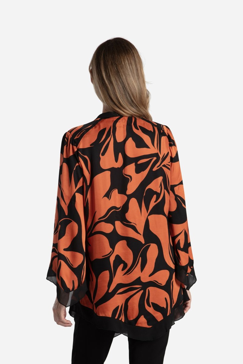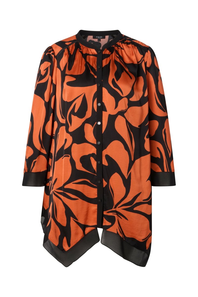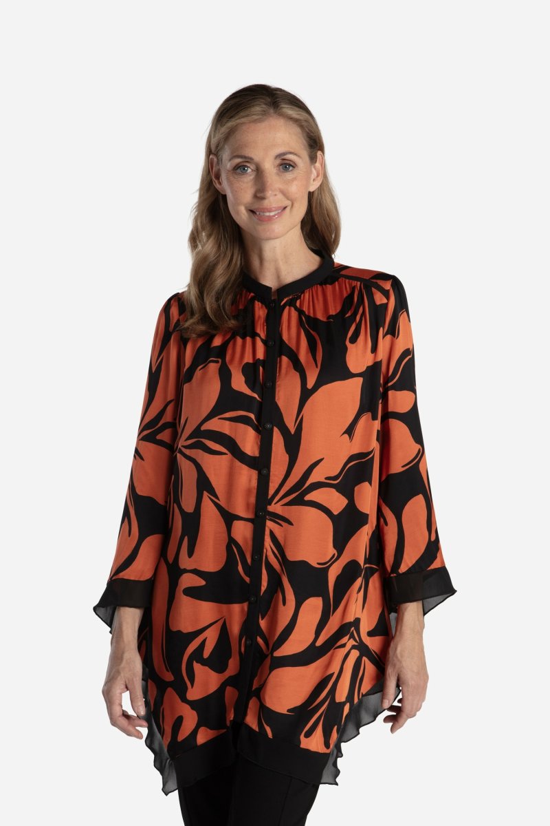 Färgstark tunika i mjuk viskos med stormönstrat print i rost och svart. Tunikan är slät med fint fall och asymmetri i nederkanten, ihop med en svart chiffongkant som även återfinns i det asymmetriska ärmslutet. Matchande svart kant runt halsringningen som löper vidare ner och bildar en knappslå. Genomknäppt modell med små, dekorativa knappar. Ok vid axelpartiet med en svart kant i sömmen.