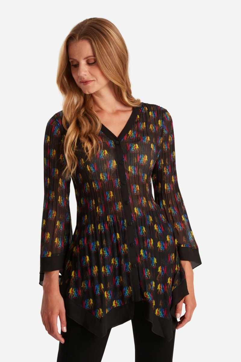 Klassisk KRISS tunika i en mjuk och skön kvalitet med modernt print i multifärg och svart. Tunikan är handkrinklad med fint fall och asymmetri i nederkanten, vilket ger ett slankande och förlängande intryck. Skirt avslut med svart chiffongkant i tunikans ärmavslut och nederkant. Matchande svart kant runt den v-ringade halsringningen som löper ner längs knappslån. Genomknäppt modell med små, dekorativa knappar.